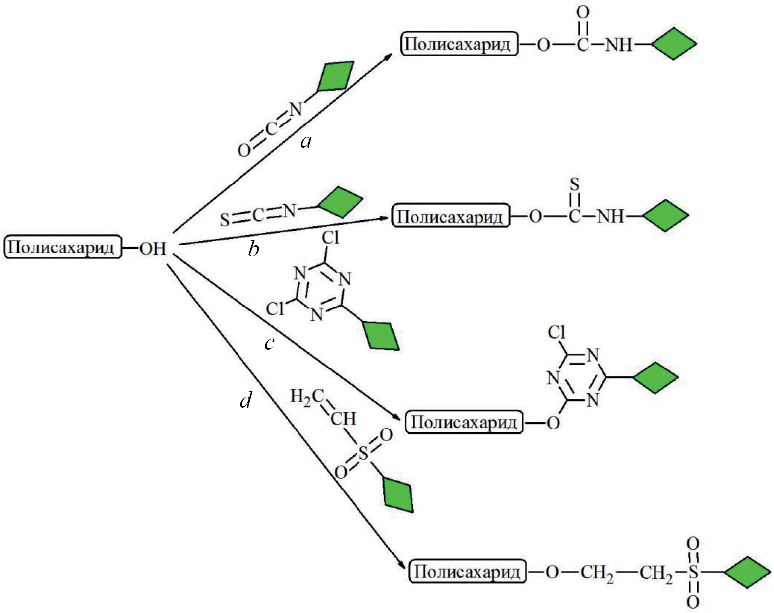 Рис. 3. Введение флуоресцентной метки по гидроксильной группе: реакция с изоцианатами (a), изотиоцианатами (b), дихлордиазином (c) и винилсульфоном (d).