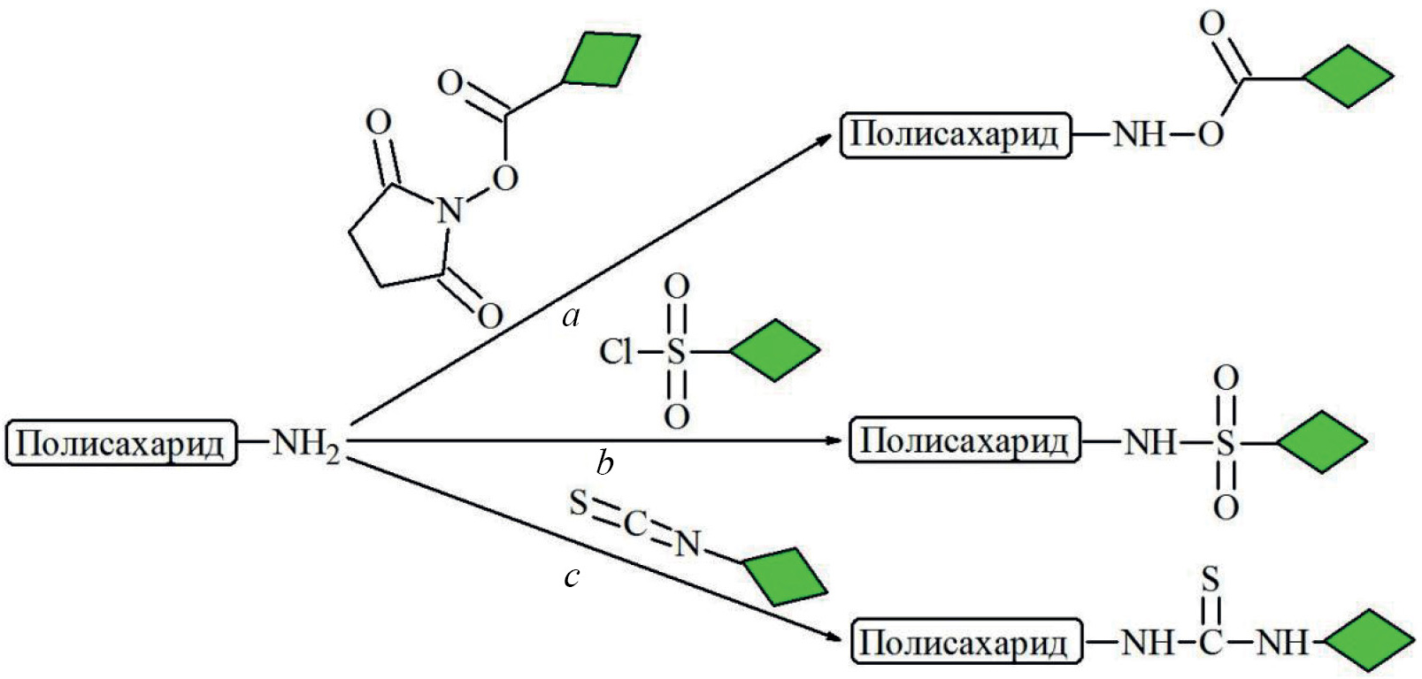 Рис. 4. Введение флуоресцентной метки по аминогруппе: реакция с сукцинимидным эфиром (a), сульфохлоридом (b) и изотиоцианатом (c).