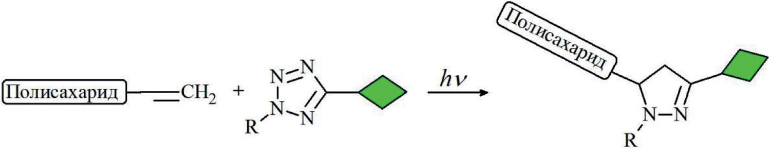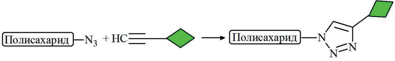 Азид-алкиновое циклоприсоединение. Для осуществления азид-алкинового циклоприсоединения (рис. 6) при мечении полисахаридов необходимо подготовить два реагента, содержащих азидную и алкиновую группы. Азидную группу вводят обычно в две стадии. Первая стадия – тозилирование или бромирование гликана, вторая – замещение введенных на первой стадии групп на азид. Реакции, как правило, проводят в апротонных растворителях, таких как диметилсульфоксид, диметилформамид и диметилацетамид [100–104]. Ацетиленовую группу вводят тремя способами. Первый способ заключается в алкилировании пропаргилбромидом алкоголята полисахарида в диметилацетамиде или в воде [103]; второй – реакция пропаргиламина с тозилированным полисахаридом в диметилформамиде [104]; третий – это этерификация полисахарида ацетиленкарбоновыми кислотами в условиях кислотного катализа [105, 106].
