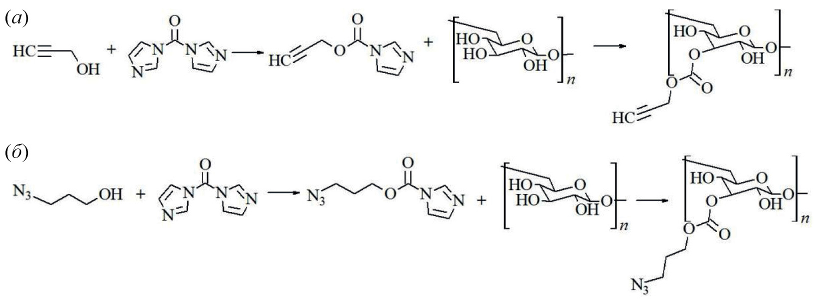 Рис. 7. Введение функциональных групп для клик-реакции с помощью карбонилдиимидазола: (а) – синтез пропаргилкарбоната декстрана, (б) – синтез азидопропилкарбоната декстрана.