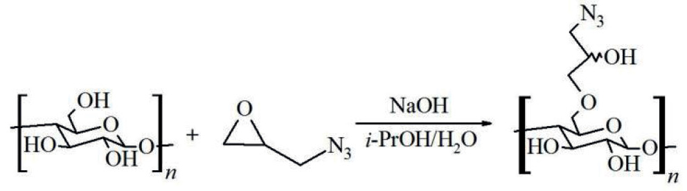 Для введения азидной группы на поверхности нанофибриллярной целлюлозы в водно-спиртовой среде при комнатной температуре предложено использовать 1-азидо-2,3-эпоксипропан (рис. 8) [111]. Полученные производные далее вводили в клик-реакцию с целью получения новых материалов, а также для введения флуоресцентной метки.
