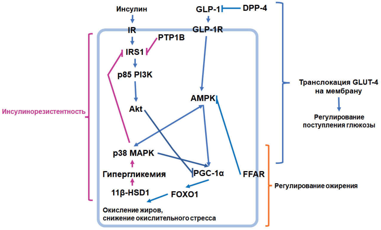 Рис. 1. Пути регулирования инсулинорезистентности, метаболизма жиров и глюкозы при СД2. Перспективными способами регулирования инсулинорезистентности считаются ингибирование 11β-HSD1, p38 MAPK, PTР1B, DPP-4, активация IRS1 и GLP-1R. Транслокации GLUT4 на поверхность мембраны способствует снижению инсулинорезистентности. Для активации окисления FFA и снижения окислительного стресса предлагается активация AMPK и PGC-1α, повышение GLP-1 и GIP, уменьшение экспрессии FFAR.
