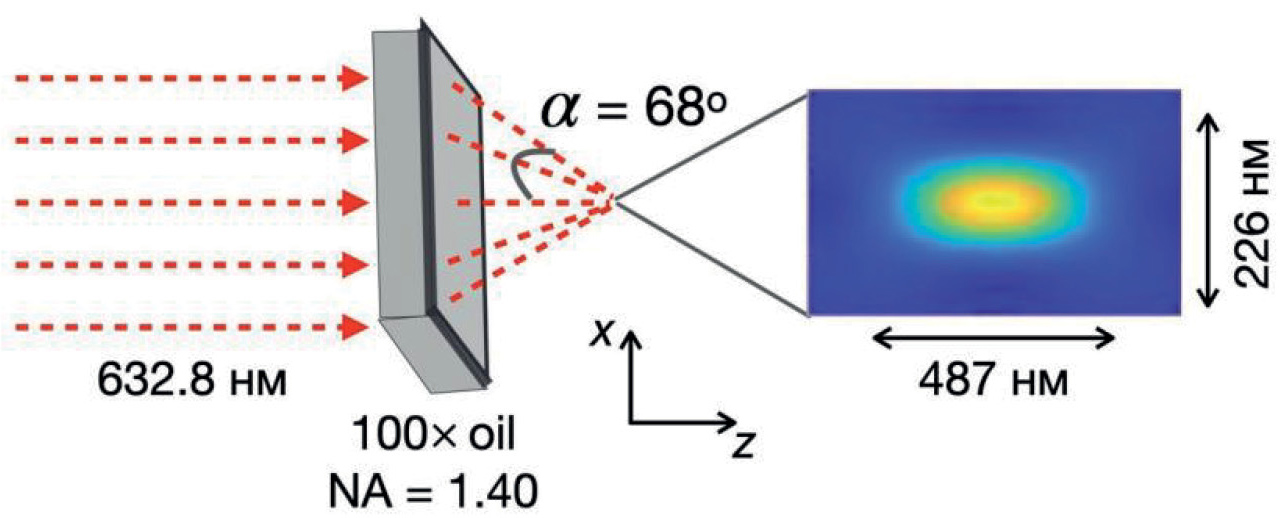 Все эти методы используют флуорофоры, которые поглощают фотоны в “основном” состоянии и испускают флуоресценцию в “возбужденном” состоянии, что позволяет улучшить контраст во флуоресцентной микроскопии. Изначально флуоресцентная микроскопия имела ограничение оптического разрешения, связанное с числовой апертурой объектива и длиной волны света, которое было описано Эрнстом Аббе [1]. Так, разрешение светового оптического микроскопа определяется следующим образом. Поскольку световая волна может быть дифрагированной, функция трехмерного рассеяния точки (Point Spread Function, PSF), создаваемая точечным объектом, имеет конечный размер. Основываясь на конструктивной интерференции в пространстве, полная ширина на полувысоте (Full Width At Half Maximum, FWHM) PSF составляет Δr ≈ λ/(2η × sinα) в фокальной плоскости и Δl ≈ λ / (η × sin2α) вдоль оптической оси, где λ – длина волны света, α – апертурный угол объектива, η – показатель преломления иммерсионной среды; Δr – FWHM PSF в латеральных направлениях, Δl – FWHM PSF в аксиальных направлениях. Как показано на рис. 1, при визуализации в видимом свете (λ = 632.8 нм) и масляном иммерсионном объективе с числовой апертурой (Numerical aperture, NA) 1.40 (NA = η × sinα) поперечный размер PSF составляет ~226 нм, а аксиальный размер PSF – ~487 нм. Таким образом, ограниченная дифракция света приводит к низкому разрешению структур, лежащих за дифракционным пределом, что создает проблемы для детекции молекулярных структур.