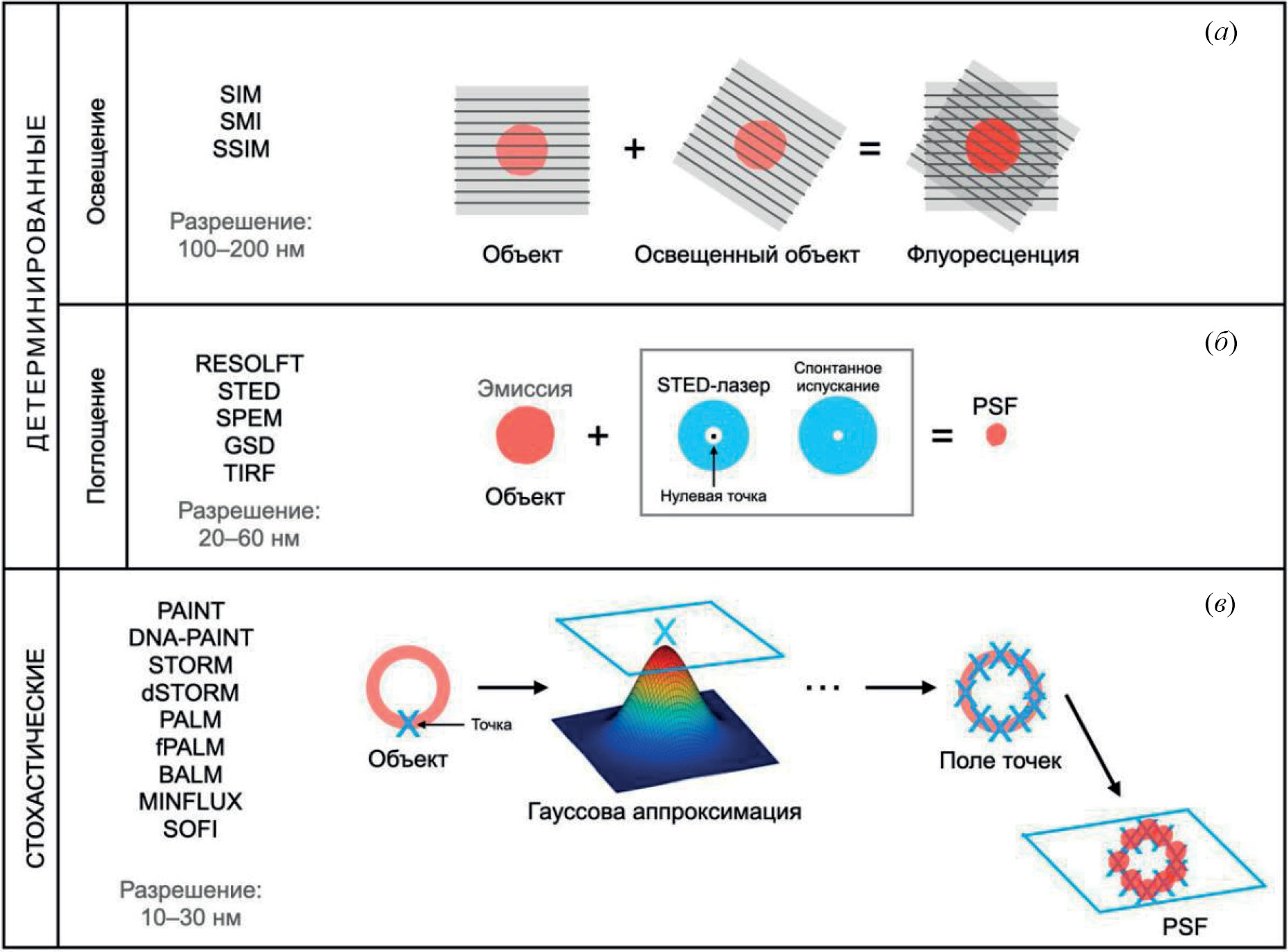 Рис. 2. Классификация методов микроскопии сверхвысокого разрешения. (а), (б) – Детерминированные методы, в основе которых лежит информация о пространственном распределении: (а) – заложенном в паттерн освещения (последовательное освещение образца стоячей волной): SIM (Structured Illumination Microscopy), SMI (Spatially Modulated Illumination Microscopy), SSIM (Saturated Structured Illumination Microscopy); (б) – о размере области, испускающей свет (отклик флуорофора на возбуждение света, которое стимулирует испускание): RESOLFT (REversible Saturable Optical Fluorescence Transitions), STED (Stimulated Emission Depletion Microscopy), SPEM (Scanning PhotoElectron Microscope), GSD (Ground State Depletion Microscopy), TIRF (Total Internal Reflection Fluorescence); (в) – стохастические методы, в основе которых лежит возможность локализации одиночных молекул практически с любой точностью, которая определяется числом зарегистрированных фотонов: PAINT (Points Accumulation for Imaging in Nanoscale Topography), DNA-PAINT (DNA Points Accumulation for Imaging in Nanoscale Topography), STORM (STochastic Optical Reconstruction Microscopy), dSTORM (Direct Stochastic Optical Reconstruction Microscopy), PALM (Photo-activated Localization Microscopy), fPALM (DNA structure fluctuation-assisted BALM), BALM (Binding-Activated Localization Microscopy), MINFLUX (Minimal Photon Fluxes), SOFI (Super-resolution Optical Fluctuation Imaging).