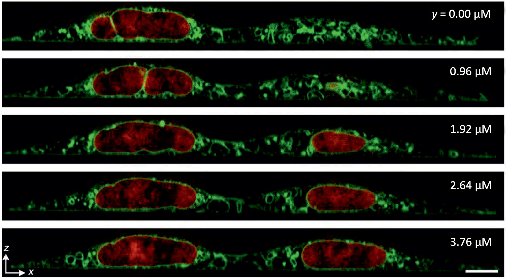 Рис. 3. 3D-STED-визуализация фиксированных клеток HeLa с флуоресцентно мечеными мембранами (зеленый) и ДНК (красный), с достижением почти изотропного разрешения, масштабный отрезок 5 мкм [24].