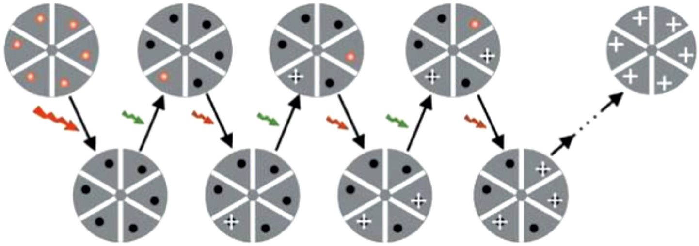 Рис. 4. Последовательность изображений STORM с использованием гипотетического гексамерного объекта, меченного красными флуорофорами, которые можно переключать между флуоресцентным и темным состоянием с помощью красного и зеленого лазеров. Все флуорофоры сначала переводятся в темное состояние импульсом красного лазера. В каждом цикле визуализации зеленый лазерный импульс используется для включения только части флуорофоров, образуя оптически разрешимый набор активных флуорофоров. Далее при красном освещении эти молекулы излучают флуоресценцию до тех пор, пока не выключатся, что позволяет с высокой точностью определить их положение (белые крестики). Затем общее изображение восстанавливается на основе положений флуорофора, полученных в результате нескольких циклов визуализации [36].