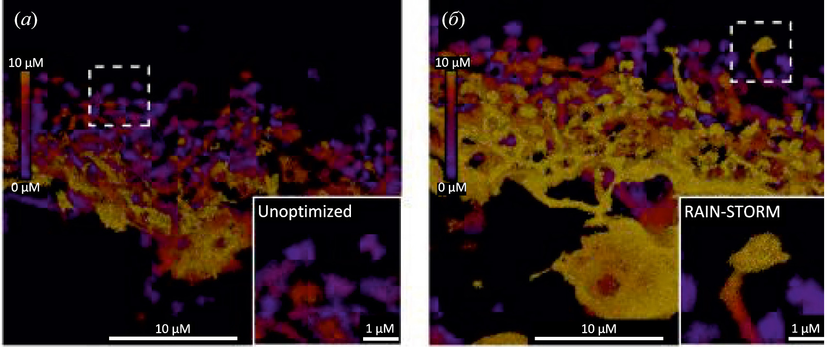Рис. 5. (а) – Неоптимизированное изображение STORM горизонтальной клетки, меченной кальбиндином. Предполагаемые синапсы нечеткие, с малой определяющей морфологией или непрерывной структурой (неоптимизированная вставка); (б) – в оптимизированных условиях RAIN-STORM как горизонтальные синапсы клеток, так и их соединительные структуры помечены и расположены рядом (оптимизированная вставка), демонстрируя четкие структурные детали по всей ветви нейронов. Изображения репрезентативны от n = 3 животных. Изображения STORM имеют цветовую кодировку по глубине (от фиолетового – 0 мкм, до желтого – 10 мкм). Масштабные отрезки 10 и 1 мкм [41].