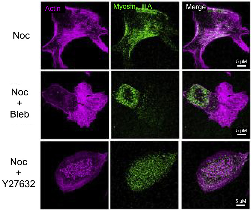 Рис. 6. Эффекты ингибирования передачи сигналов Rho/ROCK-миозина IIA на нокодазол-индуцированную разборку кластеров подосом. Репрезентативные двухцветные результаты STORM актина и миозина IIA в отдельных макрофагах, культивированных в течение 16 ч и затем обработанных Noc (10 мкМ), Noc (10 мкМ) + Y27632 (20 мкМ) и Noc (10 мкМ) + Bleb (20 мкМ) в течение 2 ч. Показаны отдельные изображения актина (фиолетовый) и миозина IIA (зеленый), а также наложенное изображение соответственно