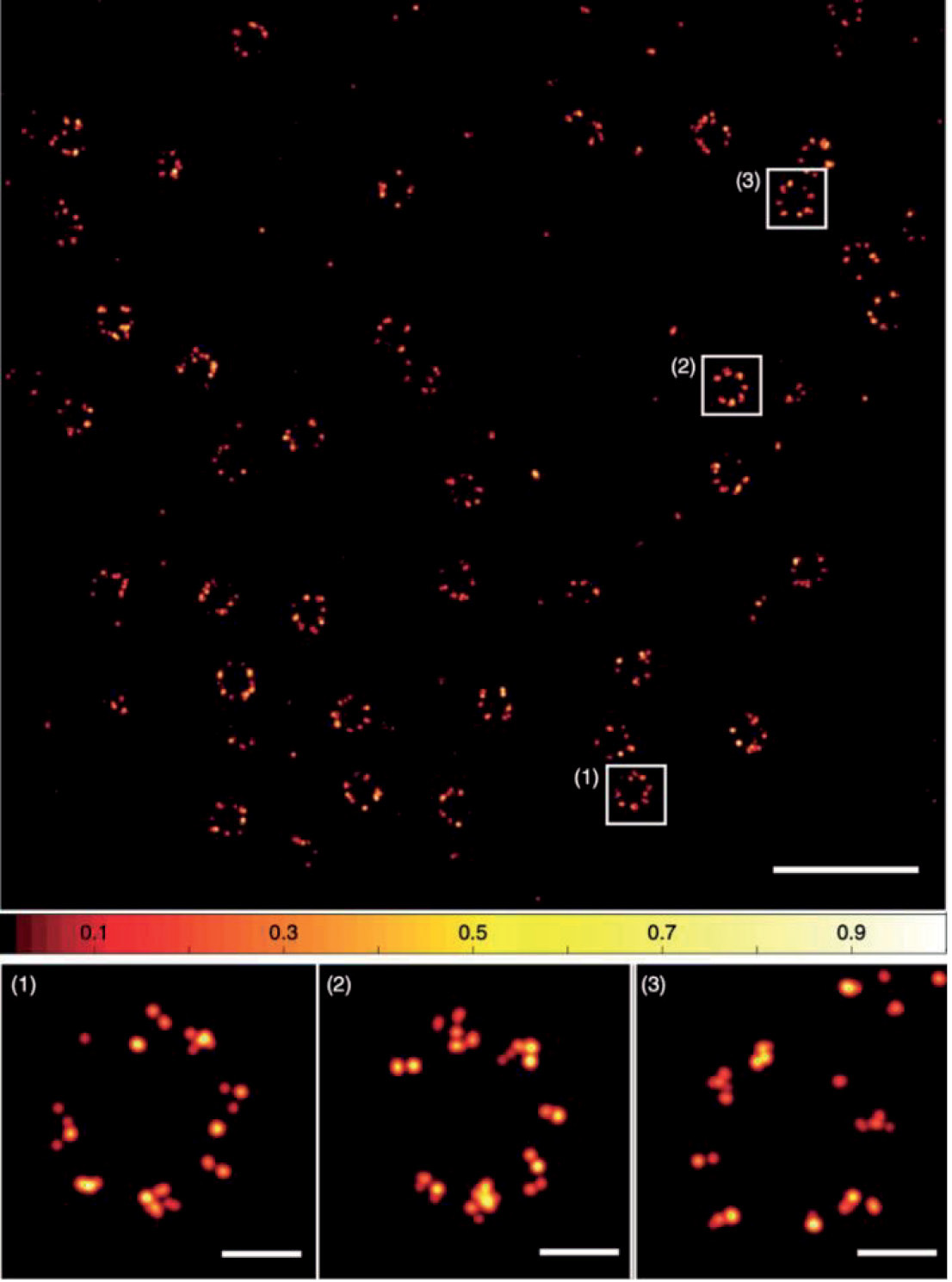 Рис. 7. Наноскопия MINFLUX клеток линии U-2 OS, экспрессирующих Nup96, белок комплекса ядерных пор (Nuclear Pore Complex, NPC), меченный органическим флуорофором Alexa Fluor 647 (сверху). Увеличенные фрагменты (ниже) показывают отдельные ядерные поры, где каждая точка выделяет группы локализаций, представляющих отдельные белки посредством их флуоресцентных меток. Масштабные отрезки: 500 нм (сверху), 50 нм (врезки) [64].