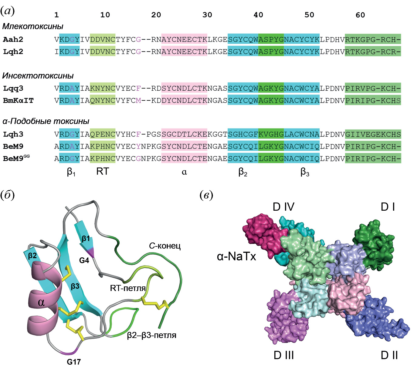 Рис. 1. Структурные особенности α-NaTx. (а) – Сравнение аминокислотных последовательностей представителей разных групп α-NaTx. Розовым обозначена α-спираль, голубым – β-тяжи, оттенками зеленого – различные участки модуля специфичности: светлый – RT-петля, темнее – β₂–β₃-петля, темный – C-концевая область. Малиновым выделены “шарнирные” глицины (остатки 4 и 17 по нумерации Aah2); (б) – пространственная организация α-NaTx на примере млекотоксина Aah2. Цветовые обозначения аналогичны панели (а). Желтым показаны дисульфидные мостики; (в) – общий вид взаимодействия α-NaTx с натриевыми каналами на примере комплекса Lqh3–hNaᵥ1.5 [7]. Naᵥ изображен цветной поверхностью с индивидуально раскрашенными гомологичными повторами D I–IV (ПД более блеклый, ПЧД – яркий). Бордовым показан Lqh3.