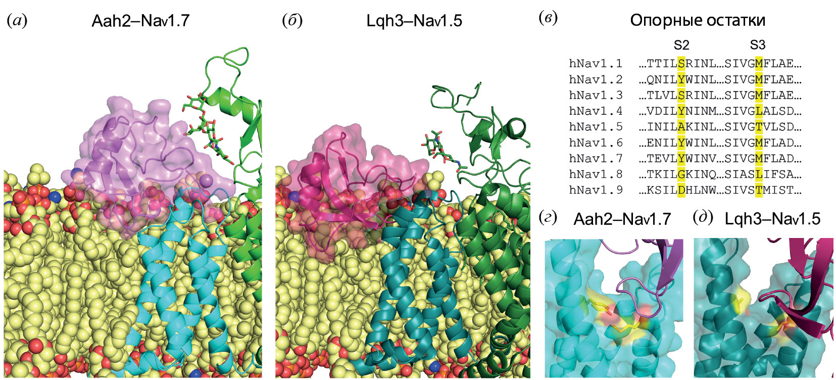 Рис. 2. Различие структуры комплексов Naᵥ с α-NaTx. (a, б) – Сайт связывания α-NaTx с Naᵥ в мембране. Голубым выделен ПЧД IV канала, зеленым – ПД I (виден гликан), розовым и малиновым показаны токсины; (в) – сравнение фрагментов аминокислотных последовательностей S2 и S3 ПЧД IV. Желтым выделены так называемые “опорные” остатки, определяющие характер посадки β₂–β₃-петли α-NaTx; (г, д) – посадка β₂–β₃-петли α-NaTx на “опорные” остатки S2–S3 ПЧД IV. Цветовые обозначения аналогичны панелям (а, б), желтым показаны “опорные” остатки.