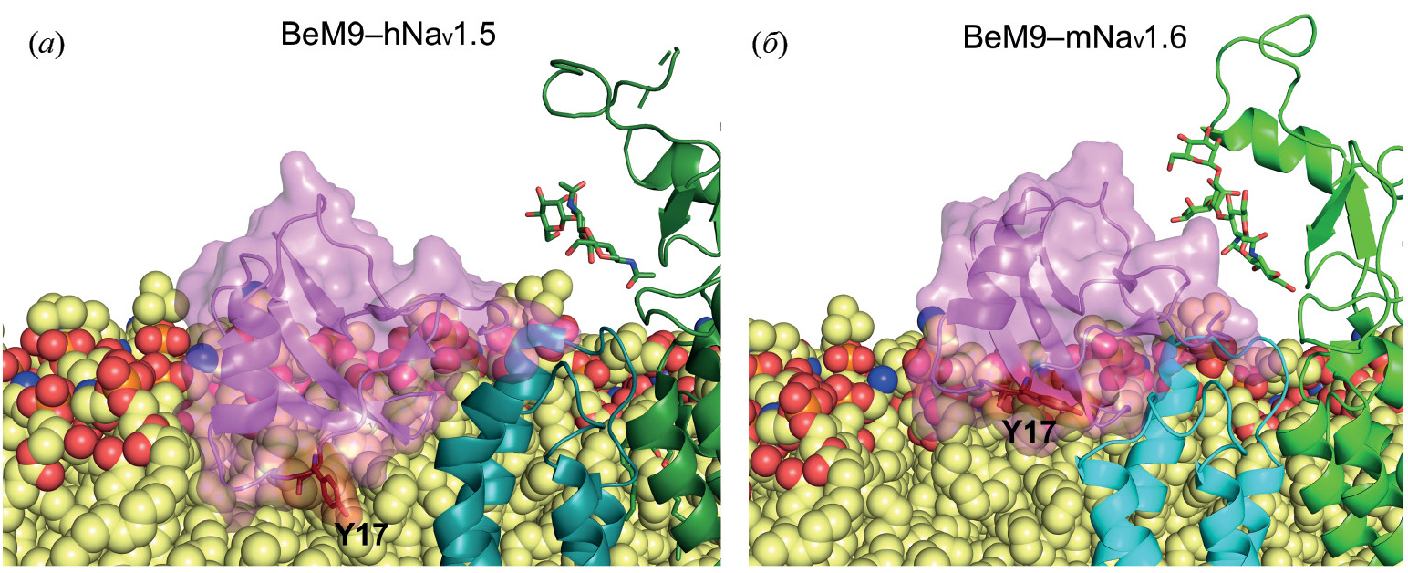 Рис. 3. Влияние мутации Y17G на связывание BeM9 с Naᵥ. Голубым выделен ПЧД IV канала, зеленым – ПД I, розовым – токсин BeM9, темно-красным показан остаток Y17, направленный в сторону мембраны у BeM9 и замещенный на глицин у BeM9GG. (a) – Модель комплекса BeM9–hNaᵥ1.5, полученная пространственным совмещением с Lqh3 из комплекса 7K18. Видно, что остаток Y17 у BeM9 заглублен в мембрану; (б) – модель комплекса BeM9–mNaᵥ1.6 (построение модели см. в “Эксперим. части”).