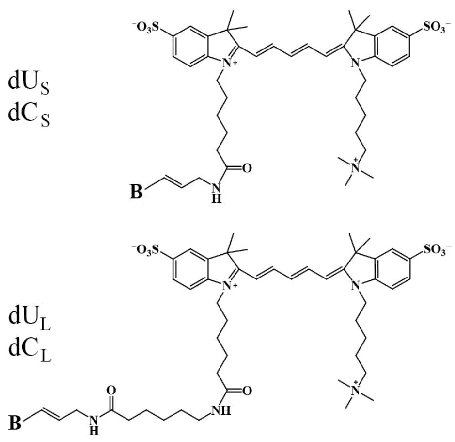 Далее по тексту аналоги dU и dC с коротким линкером обозначены литерой S, с длинным – литерой L. Выбор электронейтрального цвиттерионного флуорофора определялся полученными ранее данными о более эффективной встраиваимости в ПЦР таких нуклеотидов по сравнению с аналогами, несущими положительный или отрицательный суммарный заряд [5, 6]. Общая схема синтеза флуоресцентно-меченных производных Cy5-дезоксипиримидиновых dNTP описана ранее [7, 8].