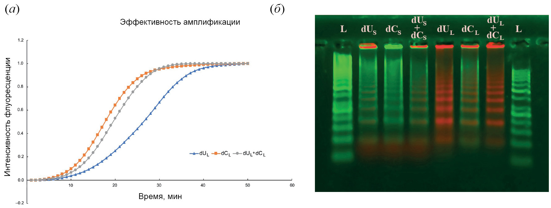 Рис. 2. (а) – Кинетика амплификации RCA на примере dUL и dCL как при индивидуальном, так и при совместном применении; (б) – электрофореграмма результатов RCA в двухканальном режиме возбуждения/детекции (“зеленый” канал 530/585 нм и “красный” канал 630/690 нм). L – маркер длин двухцепочечной ДНК GeneRuler 50 bp (Thermo, Латвия).