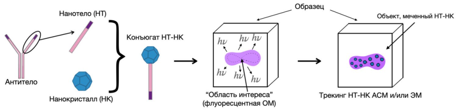 Важно отметить, что для создания подобных меток необходимо использование конъюгатов нанокристаллов и наноантител (однодоменных антител), которые за счет своего небольшого размера значительно глубже проникают в объемные образцы, чем обычные антитела, что должно способствовать более глубокому и мягкому, сохраняющему ультраструктуру, окрашиванию образца.