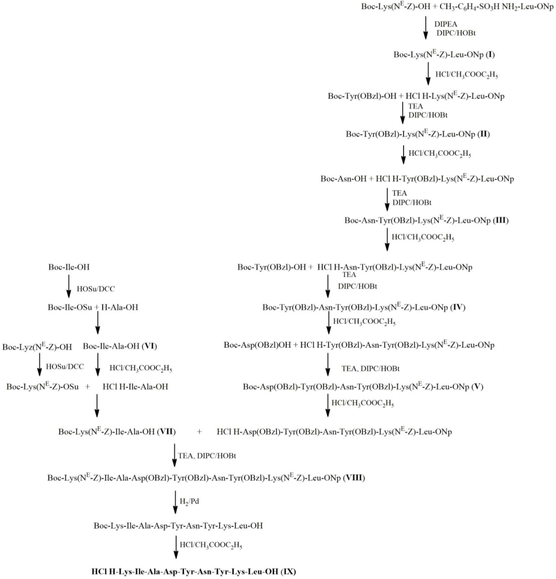 N-Концевой трипептид (VII) получали методом активированных эфиров, причем Boc-Lys(Nε-Z)-OSu и Boc-Ile-OSu вводили в реакцию, отфильтровав осадок дициклогексилмочевины, что позволило сократить время и количество растворителей на выделение эфиров. Нанопептид (VIII) получали с использованием карбодиимидного метода. Защиту с боковых функциональных групп аминокислот удаляли гидрированием пептида над катализатором (палладиевой чернью) в растворе уксусной кислоты.