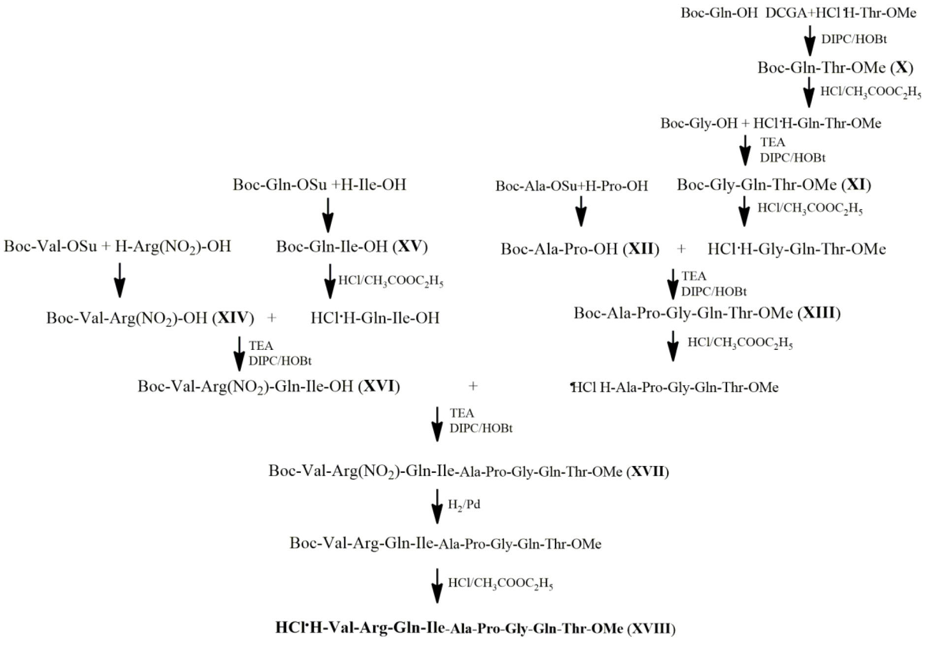 Для синтеза пептида (XVIII) была предложена схема 2. С-Концевой пентапептид (XIII) получали конденсацией трипептида (XI) и дипептида Boc-Ala-Pro-OH (XII). Последний получали методом активированных эфиров с использованием Boc-Ala-OSu, который вводили в реакцию без выделения. N-Концевой тетрапептид (XVI) получали путем сшивки двух дипептидов, Boc-Val-Arg(NO2)ОН и HCl∙H-Gln-Ile-OH, также полученных с использованием активированных эфиров.