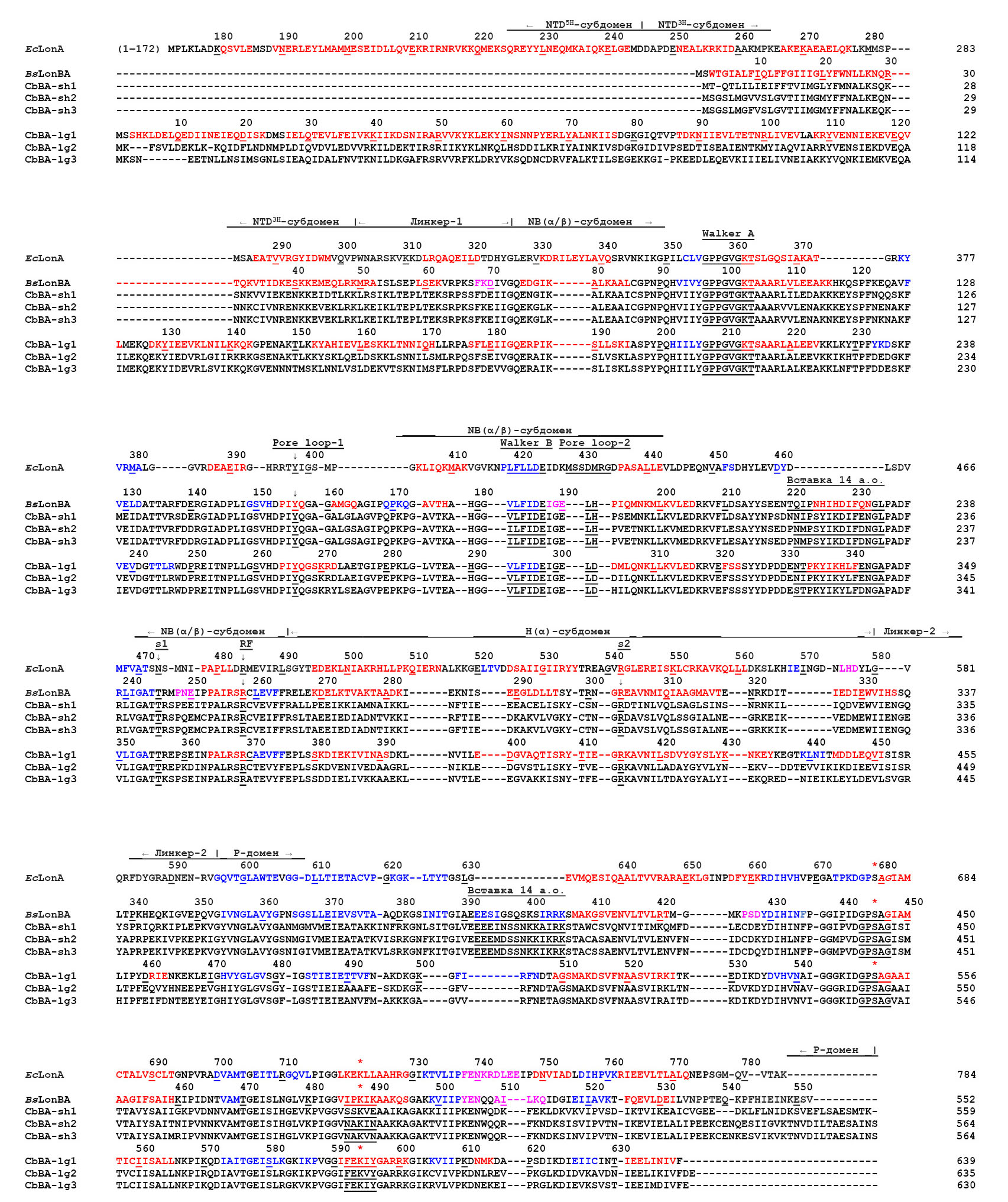 На рис. 2 представлено сопоставление последовательностей BsLonBA, а также трех коротких и трех длинных LonBA-протеаз C. botulinum с последовательностью модельной EcLonA-протеазы, выполненное с учетом известных данных по 3D-структурам EcLonA и BsLonBA. При этом в отношении BsLonBA были использованы экспериментально определенная кристаллическая структура Р-домена и предсказанная структура А-фрагмента этого фермента [2]. Вторичная структура CbLonBA-lg1 – одной из длинных LonBA-протеаз C. botulinum – предсказана с помощью программы PSSpred (https://zhanggroup.org/PSSpred/).
