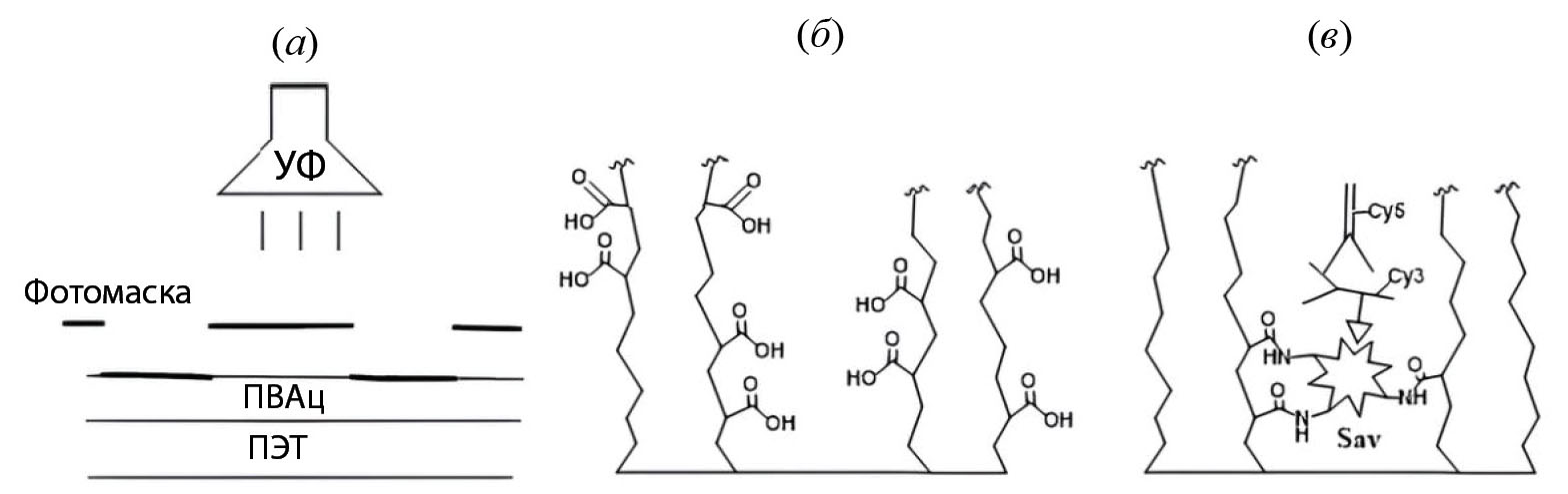 Рис. 1. Схема получения биочипа методом фотолитографии (a), схематичное изображение ячейки из щеточных полимеров (б) и последующей иммобилизации стрептавидина (Sav) и тройного комплекса Sav–Human IgG–Goat anti-Human-Сy5 (в).
