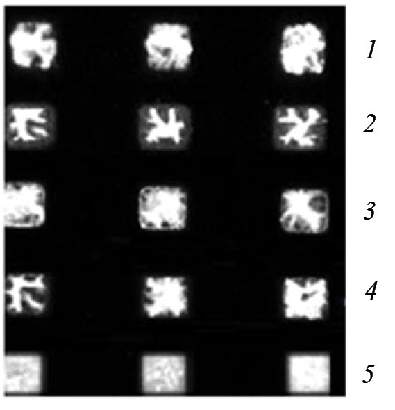Рис. 2. Флуоресцентное изображение ячеек биочипа в свете флуоресценции красителя Cy5 после активации ячеек различными реагентами и иммобилизации красителя Cy5-NH2: 1 – активация ячеек EDC/NHS в DMSO, 2 –TSTU/NHS в DMSO, 3 – HBTU/NHS в DMSO, 4– COMU/NHS в DMSO, 5 – EDC/NHS в MES-буфере.