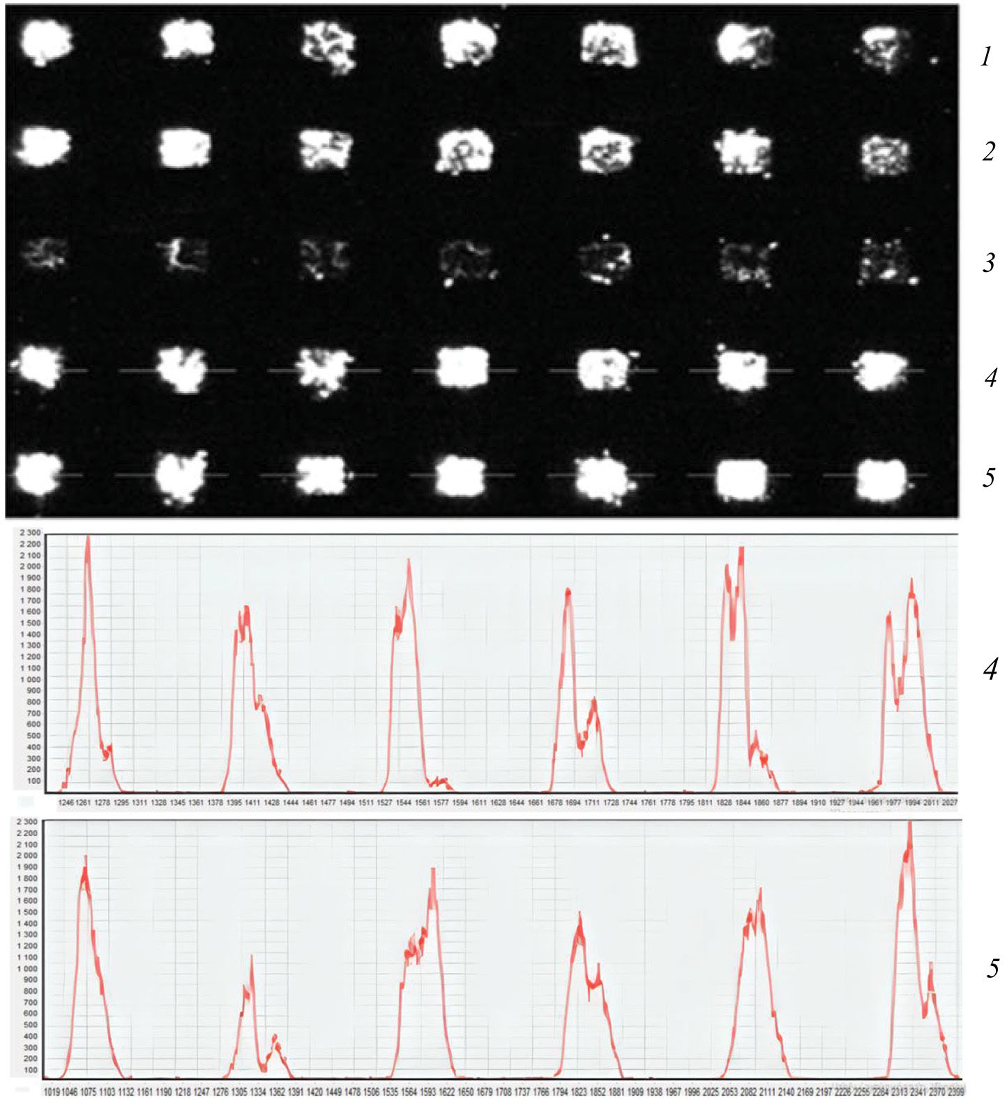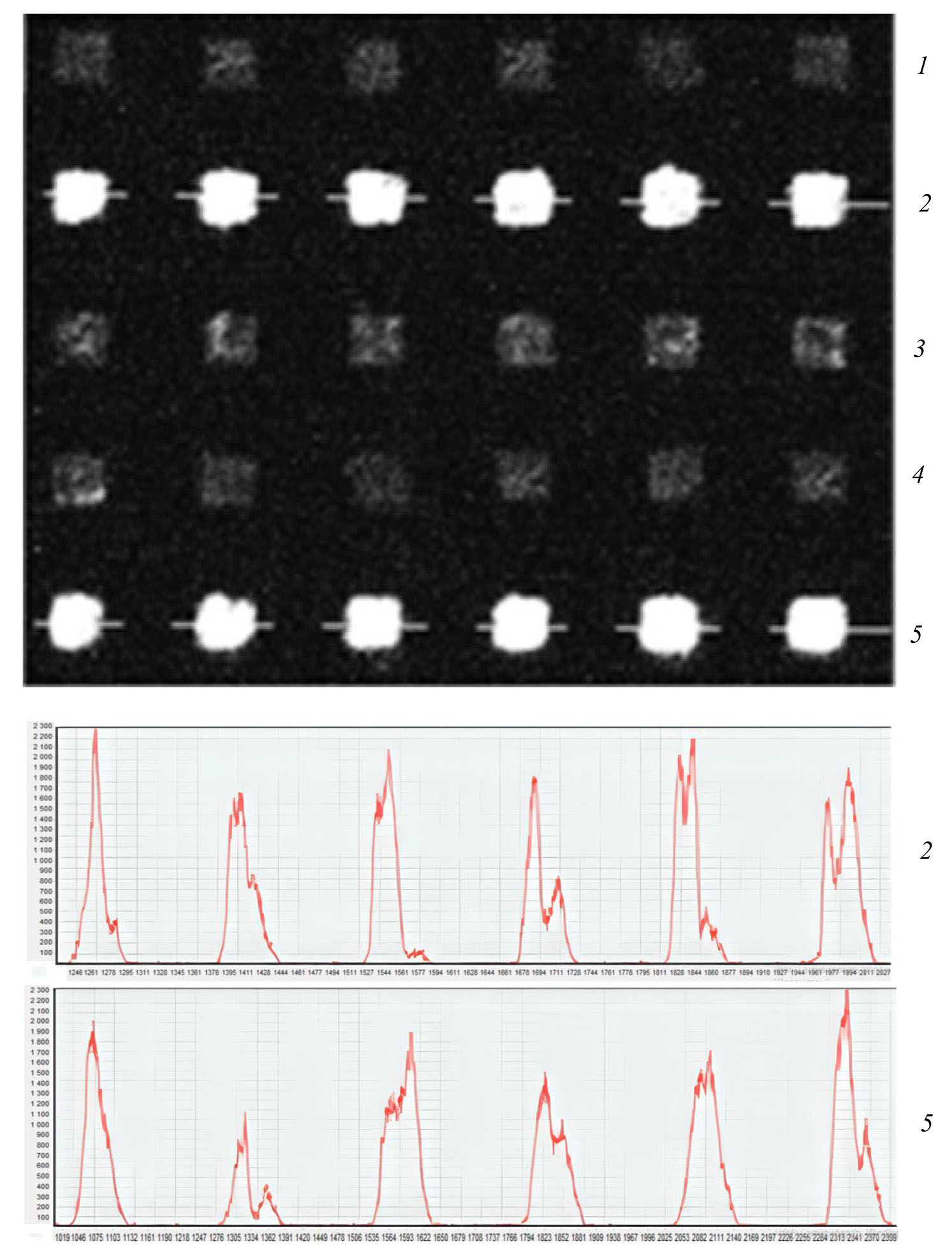 На рис. 4 представлена флуоресцентная картина биочипа в свете флуоресценции красителя Су3 после иммобилизации стрептавидина (Sav) и стрептавидина, маркированного Су3 (Sav-Cy3). На графике распределения флуоресцентных сигналов на канале Cy3 вдоль проведенных линий на флуоресцентном изображении рядов 2 и 5 со стрептавидином, маркированным красителем Sav-Cy3, видно, что сигналы между ячейками и внутри ячеек распределены не совсем равномерно. Так, вычисленные средние сигналы по рядам 2 и 5 с Sav-Cy3 составляют 720 и 914 отн. ед. соответственно.