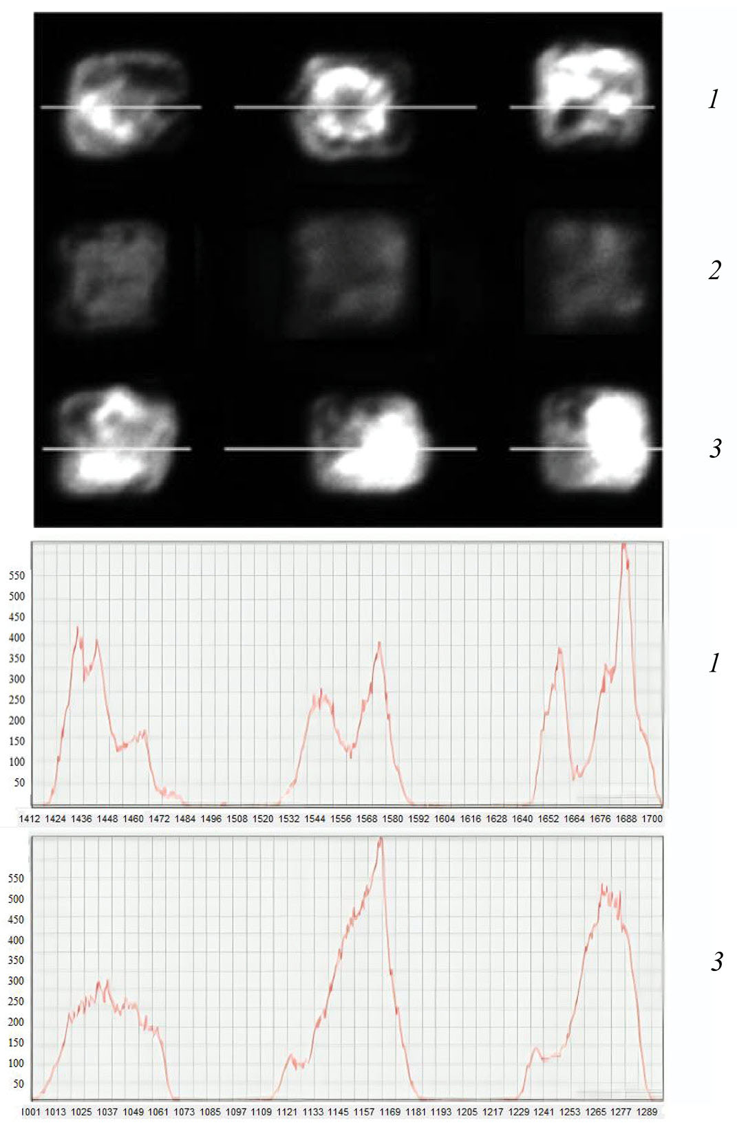 Рис. 6. Флуоресцентная картина биочипа в свете флуоресценции красителя Су3 с иммобилизованным стрептавидином после инкубации с иммуноглобулинами человека, маркированными биотином и красителем Су3 (Human IgG-Bio-Су3) – ряды 1 и 3; ряд 2 – пустые ячейки. Показан график распределения сигналов вдоль проведенных линий 1 и 3 на флуоресцентном изображении.