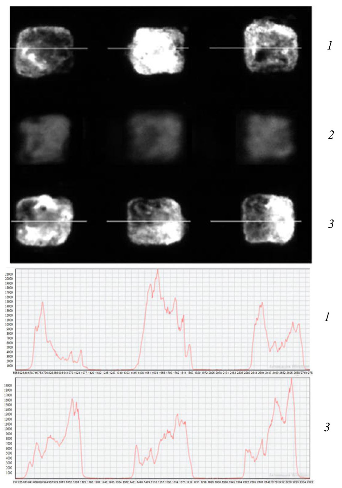 Биотинилированные иммуноглобулины человека (Human IgG-Bio-Су3) нековалентно иммобилизовали в ячейках биочипа через специфическую связь биотин–стрептавидин. На рис. 6 представлена флуоресцентная картина биочипа в свете флуоресценции красителя Су3 после иммобилизации Human IgG-Bio-Су3. Показан график распределения сигналов вдоль проведенных линий на флуоресцентном изображении рядов 1 и 3. Видно, что сигналы между ячейками и внутри ячеек распределены неравномерно.