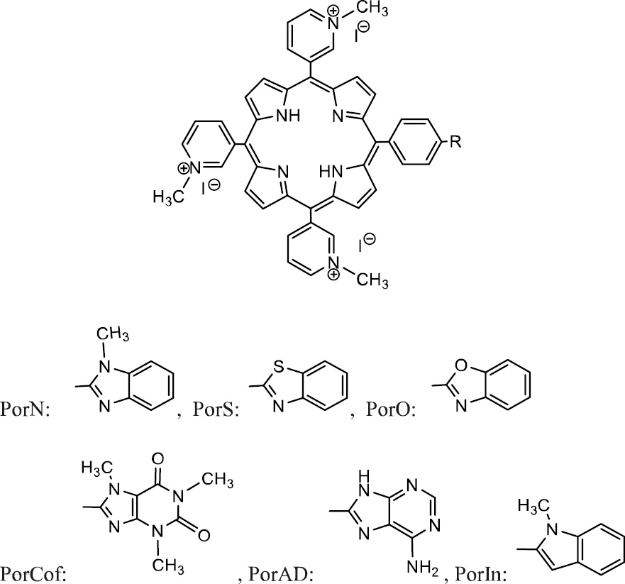 Был синтезирован ряд трикатионных порфиринов, содержащих в четвертом фенильном заместителе порфирина гидрофобные группы: –C(O)C7F15, –C(O)CH=CH2, C(O)CH3, –C(O)C7H15 и –C(O)C15H31, изучено их взаимодействие с ДНК [67]. В работе убедительно показано, что порфирины интеркалируют в ДНК тимуса теленка, увеличение гидрофобности заместителей обеспечивает более высокую аффинность и фотобиологическую активность в отношении плазмидной ДНК pRTI5.