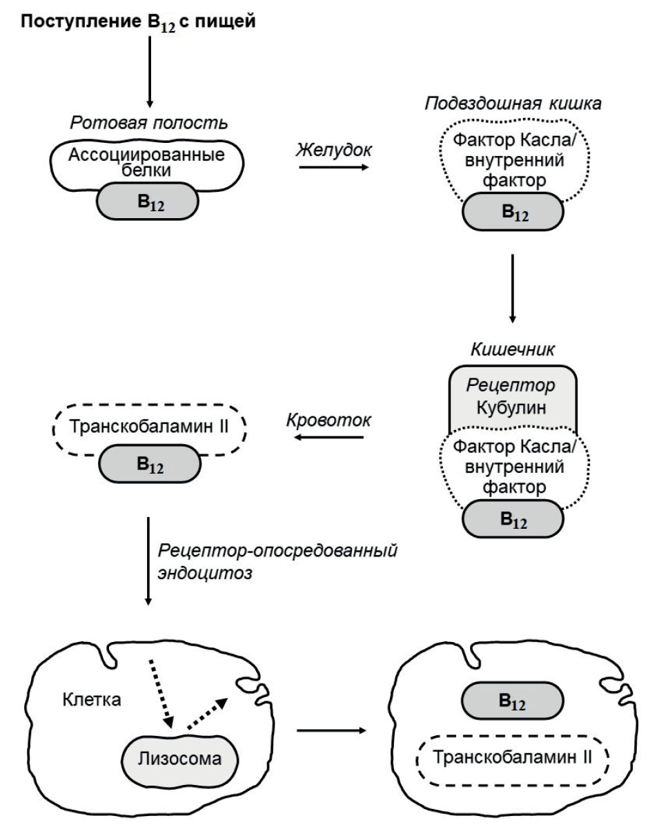 Связанный с белками В12 попадает в пищеварительную систему с пищей (рис. 2). Высвобождение В12 происходит в желудке в результате кислотного гидролиза белков, после чего витамин образует комплекс с белком транскобаламином I, что позволят защитить В12 от возможных химических превращений в агрессивной среде желудка [2].