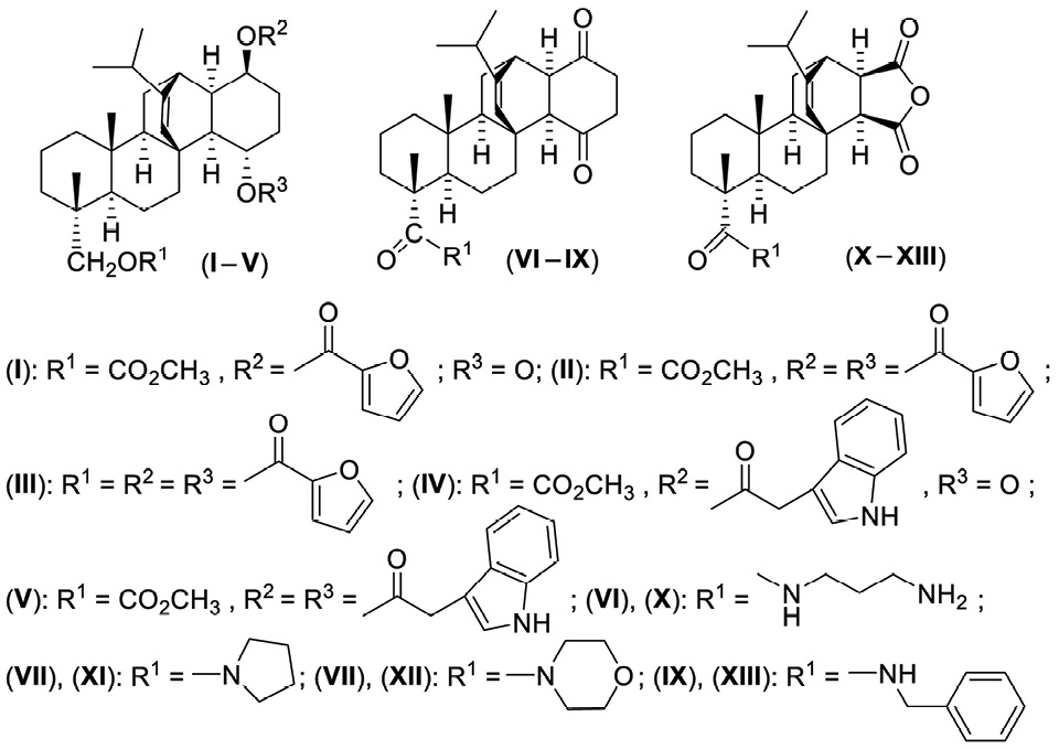С целью изучения влияния заместителей в указанных положениях дигидрохинопимаровой кислоты и анализа влияния структуры дитерпенового соединения на цитотоксическую активность нами были синтезированы 1-, 1,4- и 1,4,20-эфиры метилдигидрохинопимарата с фрагментами фурановой и индолуксусной кислот (I–V) и С20-амиды дигидрохинопимаровой и малеопимаровой кислот с фрагментами линейных, гетероциклических и ароматических аминов (VI–XIII). Синтез указанных соединений осуществляли согласно описанным в литературе методикам [16, 17]. Структуры синтезированных производных (I–XIII) представлены на рис. 1.