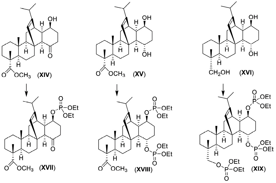 Общая методика синтеза соединений (XVII–XIX). К перемешиваемому раствору 1 ммоль соответствующего дитерпенового спирта (XIV–XVI) в 10 мл пиридина в присутствии каталитического количества диметиламинопиридина при 0°C по каплям добавляли диэтилхлорфосфат (0.28 мл (1.9 ммоль) для соединения (XVII), 0.56 мл (3.8 ммоль) для соединения (XVIII) и 0.84 мл (5.7 ммоль) для соединения (XIX)), медленно доводили температуру до комнатной и продолжали перемешивание в течение 6–8 ч. После завершения реакции (ТСХ-контроль) реакционную смесь выливали в холодную воду (50 мл). Образующийся осадок отфильтровывали, промывали водой до нейтрального значения pH, сушили и очищали методом колоночной хроматографией на SiO2, используя смесь петролейный эфир–этилацетат в объемном соотношении от 5 : 1 до 1 : 1 в качестве элюента.
