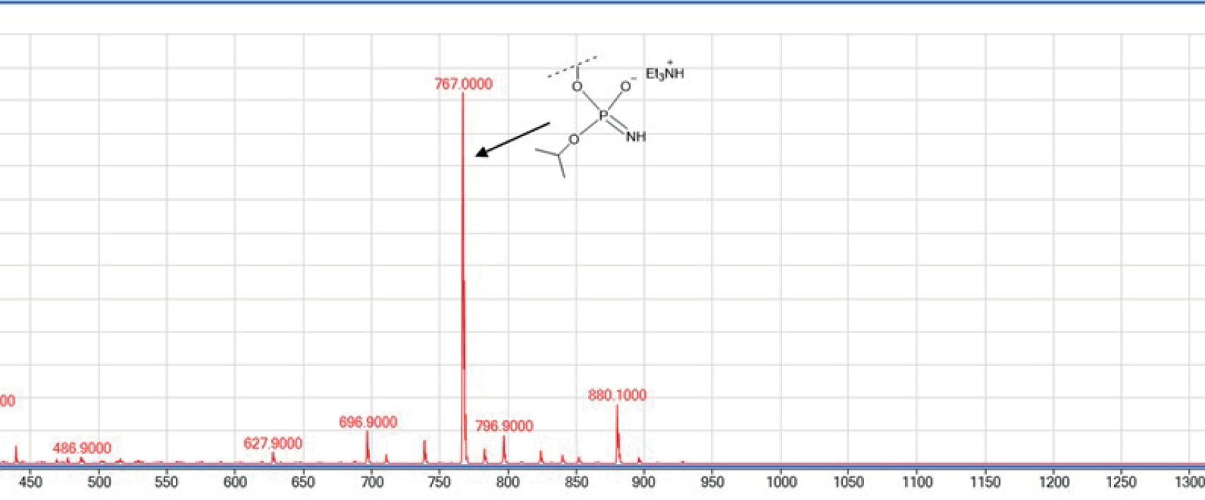 Обработка амидофосфата (IV) сильным основанием 1,8-диазабицикло[5.4.0]ундец-7-еном (DBU) должна была привести к получению изопропильного P-NH2-производного тимидилата (VI) (ожидаемый амидофосфат). К удивлению, химический сдвиг атома [31P]-фосфора, зарегистрированный для хроматографически чистого DMTr-2'-дезокситимидин-3'-изопропиламидофосфата (V) (в форме смеси Rp- и Sp-диастереомеров), составил значения, равные 8.4 и 8.9 м.д. По данным работ [41, 47], для атома фосфора в составе P-NH2-модификации в цепи олигонуклеотида должны были бы регистрироваться значения химических сдвигов в диапазоне 9.5–10.5 м.д. (в зависимости от растворителя), что соответствует, по мнению авторов указанных работ, именно электронейтральной форме амидофосфатного звена. Позднее, получив Т*T5-олигонуклеотид (здесь и далее по тексту звездочкой указано месторасположение амидофосфатного звена, имеющего структуру –(OPO(O)(NH2))– или –(OPO(O–)(NFmoc))–, при необходимости уточнения приводятся сокращенные обозначения, например, T(–P(V) –NH2–)T или T(–P(V)=N-Fmoc–)T), мы зарегистрировали химический сдвиг атома фосфора в составе амидофосфатного остатка, равный 11.8 м.д. (рис. S3 в дополнительных материалах), что соответствует ранее опубликованным данным [41, 47]. Мы считаем, что ожидаемый амидофосфат –(OPO(O)(NH2))– (VI) (схема 1), после хроматографического выделения в присутствии избытка триэтиламина ((С2H5)3N), должен преимущественно находиться в виде стабильной ионизированной имидофосфатной формы –(OPO(N=H)(O–))(Et3NH+)– (V). Этот факт подтверждается тем, что соединение (V) по данным ESI-MS-анализа (рис. 1) таковым и является, т.е. представляет собой солевую форму амидофосфата. Полученные данные хорошо согласуются с результатами работы [48], в которой показано, что амидофосфаты проявляют свойства слабых кислот (pKa ~ 8.2).