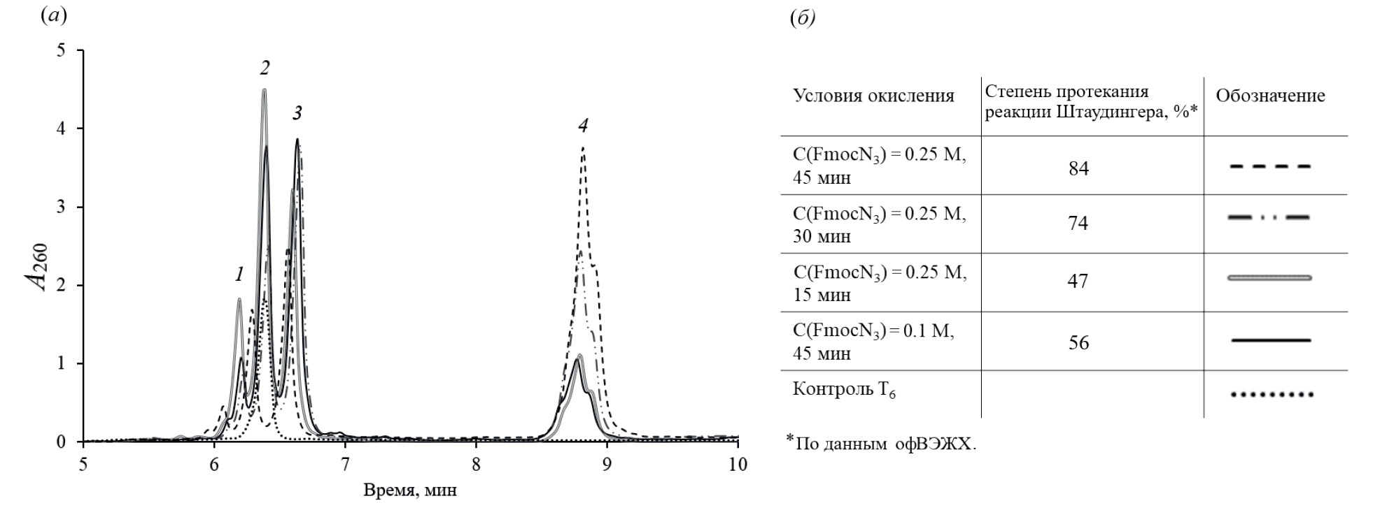 Рис. 2. (а) – офВЭЖХ-анализ реакционных смесей гексатимидилатов (T*T5), полученных в разных условиях окисления по реакции Штаудингера и обработанных концентрированным водным аммиаком в течение 30 мин при 25°С. Градиент концентрации ацетонитрила 0–30% за 15 мин. Соотнесение пиков проводили по совокупности данных масс-спектрометрического анализа (рис. S4 в дополнительных материалах) и сравнения с контрольным олигонуклеотидом T6: пик 1 – Т5, пик 2 – Т6, пик 3 – T(–P(V)–NH2–)T5, пик 4 – T(–P(V)=N–Fmoc–)T5; (б) – условия окисления и степень протекания реакции Штаудингера без учета степени деструкции модифицированного звена, полученные как отношение суммы интегральных площадей пиков 3 и 4 к сумме интегральных площадей всех компонентов реакционной смеси (по данным офВЭЖХ).