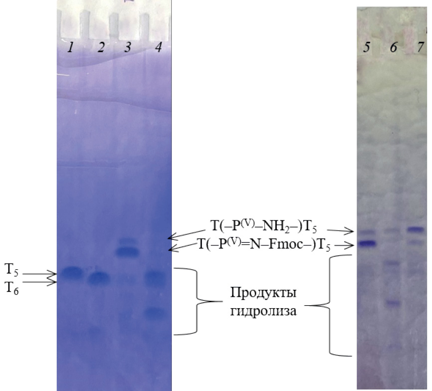 Рис. 3. ПААГ-электрофорез в денатурирующих условиях (8 М мочевина, 89 мМ Tris-боратный буфер, pH 8.3) реакционных смесей олигонуклеотидов T*T5, полученных по протоколу, описанному в табл. 1, с использованием 0.25 М раствора FmocN3 и продолжительностью окисления по реакции Штаудингера 45 мин в зависимости от последовательной постсинтетической обработки: 1, 2 – контрольные T5 и T6 соответственно; 3, 5 – аммонолиз (концентрированный водный аммиак, 30 мин), детритилирование (80%-ная уксусная кислота, 10 мин); 4 – детритилирование на CPG (3%-ная трихлоруксусная кислота в CH2Cl2, 2 мин), удаление Fmoc-группы на CPG (2%-ный раствор DBU в ацетонитриле, 5 мин), аммонолиз (метанольно-аммиачная смесь, 2 ч); 6 – аммонолиз (концентрированный водный аммиак, 30 мин), детритилирование (80%-ная уксусная кислота, 10 мин), дополнительный аммонолиз (концентрированный водный аммиак, 24 ч); 7 – аммонолиз (концентрированный водный аммиак, 30 мин), детритилирование (80%-ная уксусная кислота, 10 мин), дополнительный аммонолиз (метанольно-аммиачная смесь, 24 ч). Отнесение основных пятен произведено по данным ESI-MS-анализа после выделения офВЭЖХ (рис. S5 в дополнительных материалах).