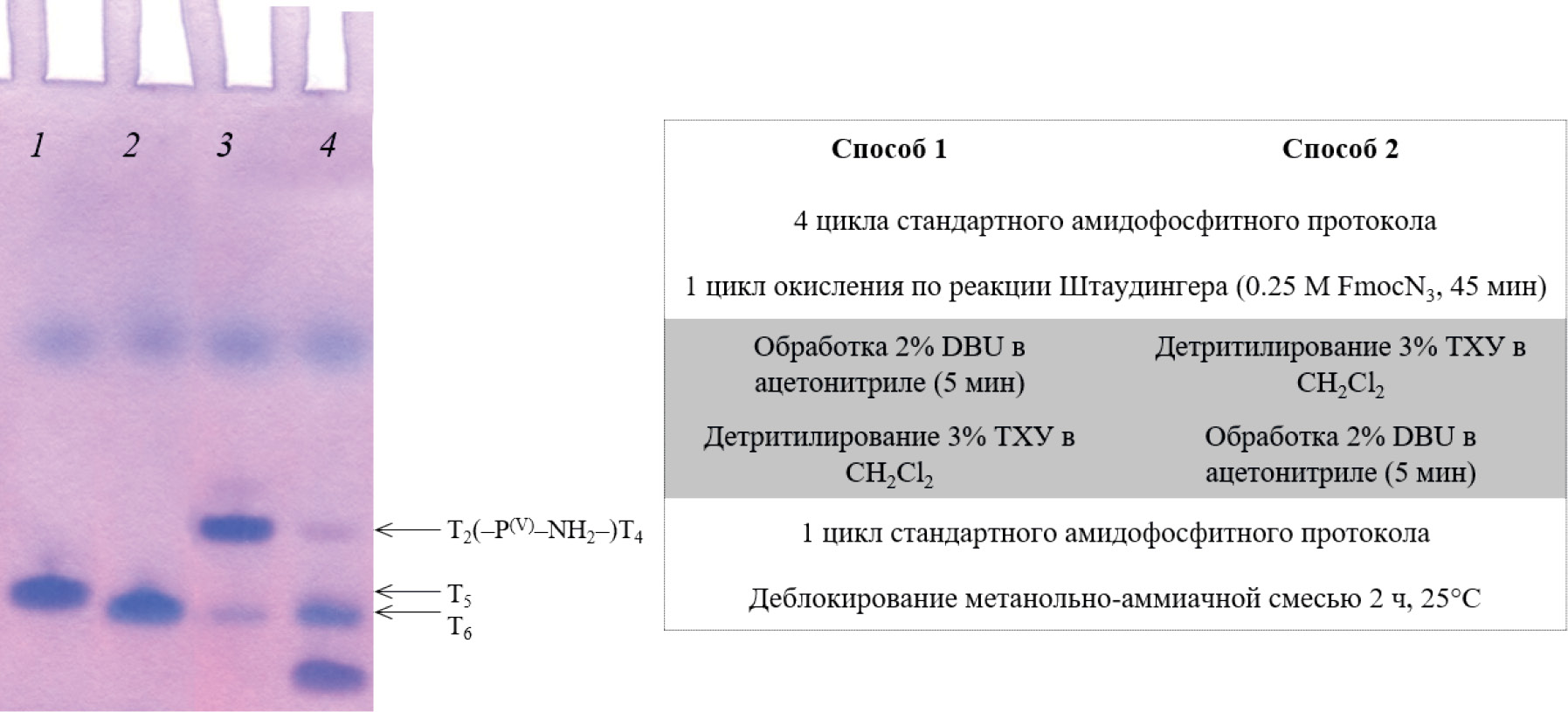 Во избежание гидролиза Fmoc-защищенного олигонуклеотида в кислых условиях в протокол синтеза ввели стадию отщепления защитных групп у амидофосфатного звена обработкой DBU, и, таким образом, в синтетическом цикле стадии детритилирования предшествует стадия отщепления Fmoc- и β-цианэтильной групп с образованием (–P(O)–NH2–)-фрагмента. Внедрение дополнительной стадии в цикл синтеза первоначально проводили вне автоматического синтезатора, для чего извлекали CPG c Fmoc-содержащим олигонуклеотидом из реакционной колонки и обрабатывали в пробирке раствором DBU в ацетонитриле в течение 5 мин при комнатной температуре. Экспериментально показано (рис. 4, дорожка 3), что свободная (–P(V)–NH2–)-связь устойчива к обработке трихлоруксусной кислотой и другими реагентами, используемым в синтетическом цикле.