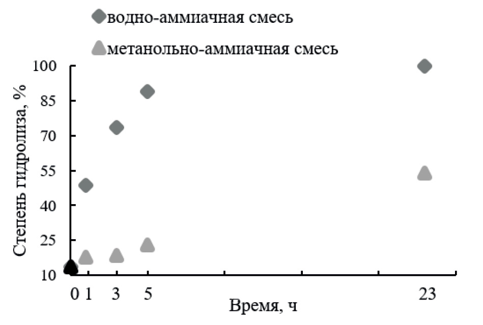 Следует отметить, что при однократной модификации конверсии в целевой продукт >85% нам добиться не удалось. Так, при синтезе олигомера Т*T5, по данным ВЭЖХ-анализа, наблюдается ~13% продуктов гидролиза после обработки CPG-связанного олигонуклеотида метанольно-аммиачной смесью в течение первых двух часов при комнатной температуре (рис. 5, точка 0; рис. S7 в дополнительных материалах, хроматография 0). Видно, что вплоть до 5 ч дополнительного выдерживания Т*T5 в среде NH3/CH3OH при 56°С значимой деградации амидофосфат-содержащего аналога не происходило. Лишь спустя сутки (56°С) уровень деградации целевого продукта приближался к 50% (рис. 5, точка 23 ч; рис. S7 в дополнительных материалах, хроматография Б4). Напротив, в случае дополнительного выдерживания в среде NH3/H2O при 56°С спустя 1 ч заметна серьезная деградация амидофосфатной группы. Следует отметить, что в случае использования для синтеза олигомеров НК коммерчески доступных мономеров со стандартными защитными группами рекомендованное время деблокирования НК водно-аммиачной смесью не превышает 40 ч при комнатной температуре [52]. В случае использования метанольно-аммиачной смеси достаточно 18 ч при комнатной температуре, что было подтверждено экспериментально (рис. S8 в дополнительных материалах). Поскольку результат эксперимента демонстрирует устойчивость амидофосфатной группы к метанольно-аммиачной смеси на довольно продолжительном промежутке времени, “исходная” степень деструкции (–P(V)–NH2–)-содержащего олигонуклеотида, полученная после первых двух часов деблокирования при комнатной температуре и превышающая 10% по данным офВЭЖХ, не может быть вызвана гидролизом модифицированного звена в ходе деблокирования.