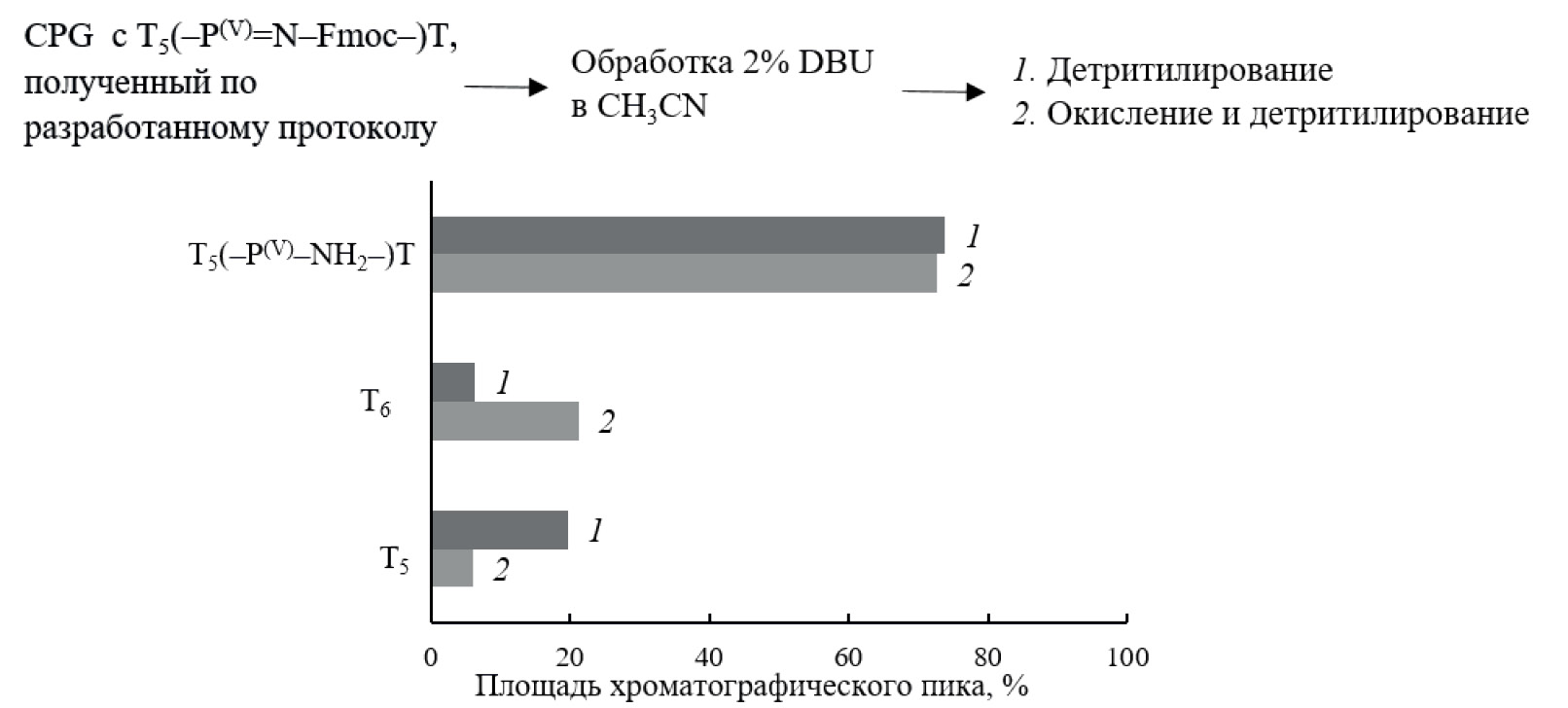 - Для выявления стадии синтетического цикла, оказывающей превалирующее влияние на устойчивость (–P(V)–NH2–)-связи, был проведен скрининг стадий и условий получения T5*T. После стадии окисления промежуточного фосфиттриэфира олигонуклеотида раствором FmocN3 (0.25 M) мы последовательно исключали все стадии технологического цикла (представлены на рис. S9 в дополнительных материалах), обрабатывая затем твердофазный носитель метанольно-аммиачной смесью и оценивая состав реакционных смесей методом офВЭЖХ. На первом этапе выявить основную стадию, в ходе которой бы наблюдалось значимое уменьшение конверсии, не удалось из-за сравнительно малого количества побочных продуктов. Анализируя состав побочных продуктов, первым делом мы решили исключить гидролиз водой, входящей в состав окислителя, и преднамеренно обработали CPG c T5(–P(V)–NH2–)T раствором, содержащим 9% воды и ТГФ в качестве растворителя. При повторном исключении стадий и анализе реакционных смесей получили прирост к содержанию T5 относительно предыдущего эксперимента, в то время как содержание T6 оставалось на прежнем уровне (рис. S9 в дополнительных материалах). Обнаруженный факт привел к заключению: гомогенность реакционных смесей PNH2-олигонуклеотидов, получаемых по разработанному протоколу, напрямую зависит от полноты протекания реакции Штаудингера и практически не обусловливается используемыми в синтетическом цикле реагентами и деблокирующими смесями. В итоге, повторив синтез T5*T с использованием дополнительного окисления иодом после стадии удаления Fmoc-защитной группы, мы получили прирост к содержанию T6 в сравнении с синтезом без дополнительной стадии окисления (рис. 6).