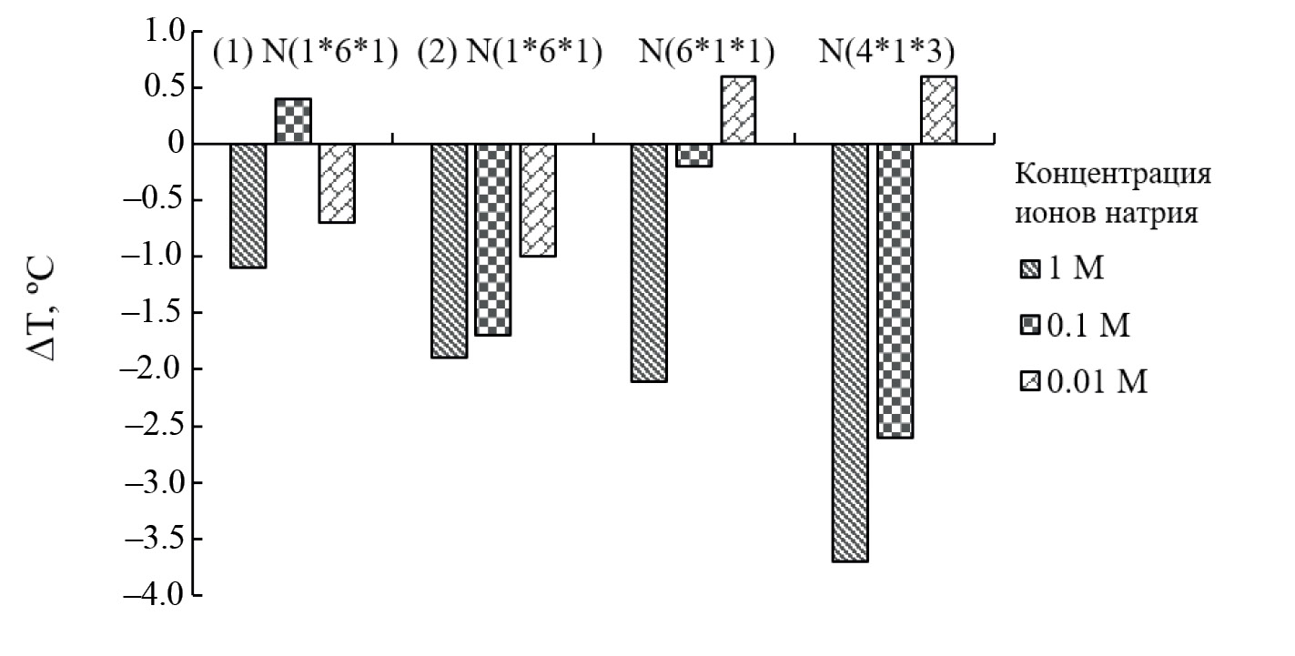 Снижение ионной силы буферного раствора (при дискретном переходе от 1 к 0.1 и до 0.01 М раствора NaCl) показало, что для рассмотренных бисмодифицированных октануклеотидов явно выражен эффект введения электронейтральной P-NH2-модификации (рис. 7; табл. S1 в дополнительных материалах). При исследовании мономодифицированных комплексов не удалось обна-ружить статистически значимую зависимость от ионной силы раствора. Очевидно, что наличие P-NH2-модификации в цепи олигомера приводит к достоверно значимому снижению зарядобусловленной компоненты энергии взаимодействия комплементарных цепей. Заметим, что в ряде случаев при пониженной ионной силе (0.01 М NaCl) (–P(V)–NH2–)-содержащие аналоги демонстрируют даже несколько большую термостабильность комплементарных комплексов с ДНК-матрицей относительно таковых с участием нативных олигонуклеотидов. При этом, по-видимому, наблюдается некоторая зависимость термодинамического эффекта от локализации, нуклеотидной последовательности сайта модификации, а также его диастереомерного состояния.
