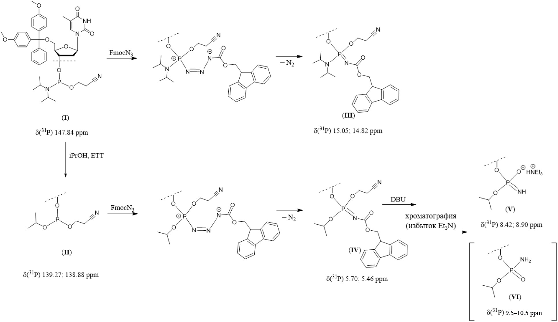 Схема 1. Стадии превращения тимидинамидофосфита при окислении FmocN3 по реакции Штаудингера с указанием 31P-ЯМР-характеристик, полученных в ходе эксперимента. Соединение (VI) не было зарегистрировано в ходе превращений и указано здесь как ожидаемый продукт с диапазоном химических сдвигов, представленным в литературе [41, 47].
