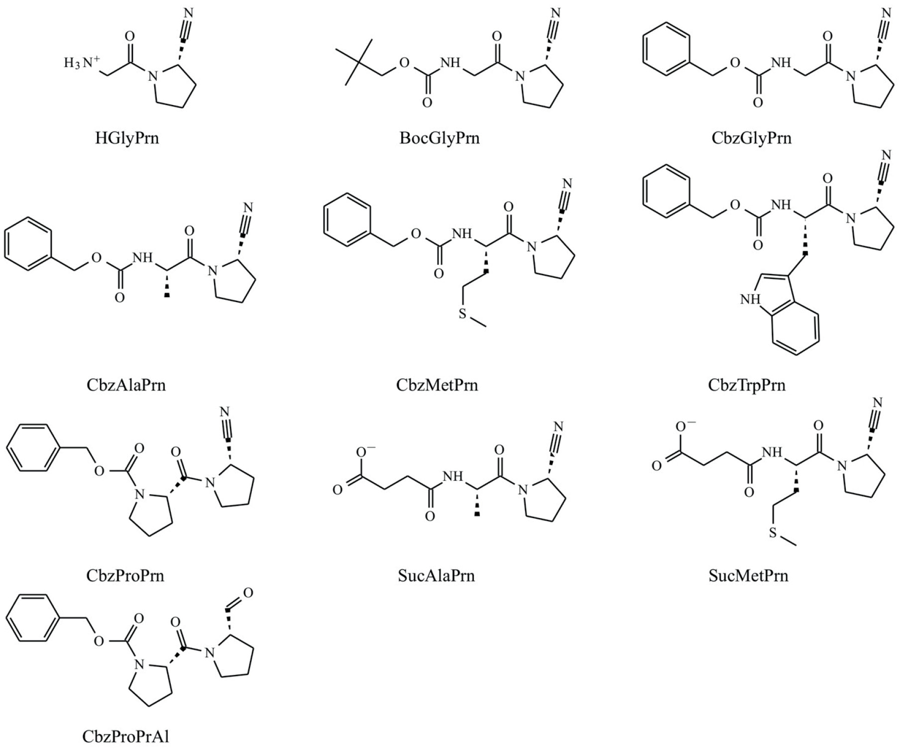 PEP и DPP4 – наиболее изученные пролинспецифические ферменты, участвующие в патогенезе ряда заболеваний. Они расщепляют пептидные связи, образованные карбоксильной группой остатка пролина и другой аминокислотой. Обе пептидазы способны с гораздо меньшей эффективностью гидролизовать связь после остатка аланина. Для PEP и DPP4, по сравнению с другими ферментами, известно наибольшее количество разнообразных специфических ингибиторов. Большой интерес к поиску ингибиторов этих ферментов объясняется исключительной ролью последних в регуляции метаболизма. К таким ингибиторам относятся альдегидные и нитрильные аналоги субстратов пептидаз, обладающие потенциалом для медицинского применения. Так, нитрильные аналоги субстратов PEP и DPP4 успешно используются в лечении болезни Альцгеймера и диабета.