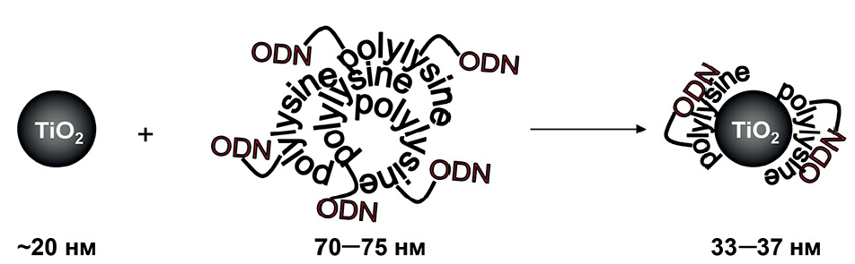 Наночастицы диоксида титана привлекают внимание как потенциальные носители фрагментов НК благодаря способности проникать через плазматическую мембрану, стабильности и возможности модификации поверхности для иммобилизации различных соединений [5–8]. Показано, что TiO2-наночастицы защищают иммобилизованные на них олигонуклеотиды от деградации в клеточной среде [9–10].