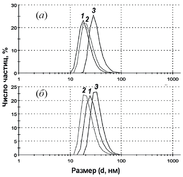 Рис. 2. Распределение частиц по размерам по данным ДСР через 1–2 ч (а) и через 3 месяца (б) после приготовления образцов. 1 – Ans, 2 – Ans/PL, 3 – Ans/PL-ODN. Концентрация частиц и нанокомпозитов – 0.1 мг/мл в расчете на Ans.