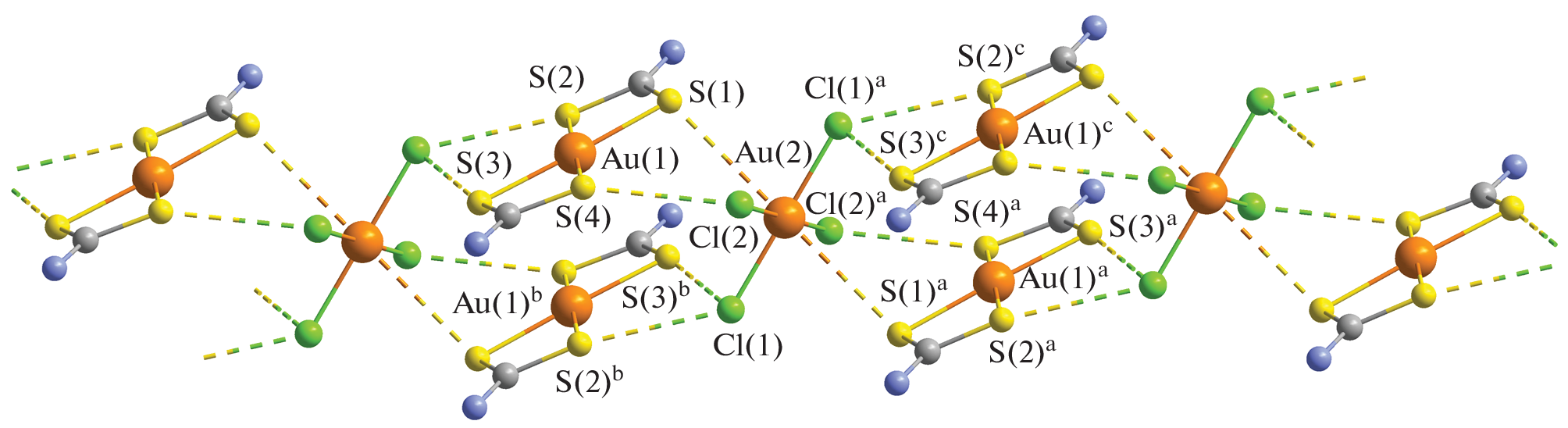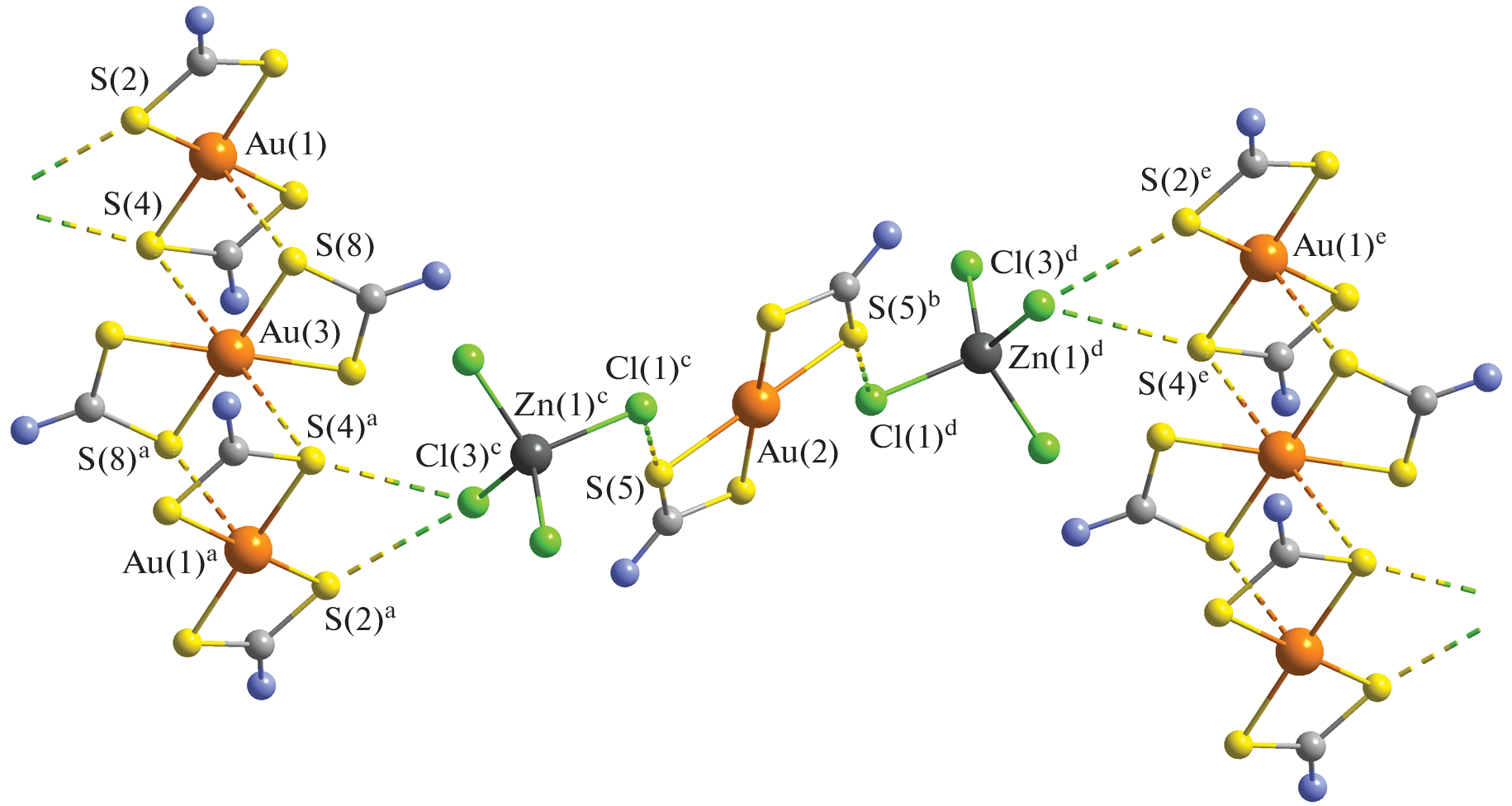 The reaction of binuclear zinc dipropyldithiocarbamate [Zn2{S2CN(C3H7)2}4] with an AuCl3/2 М HCl solution is studied. The double ionic complex [Au{S2CN(C3H7)2}2]2[ZnCl4] (I) is identified as the main species of gold(III) binding in the heterogeneous system under study and is characterized by 13С and 15N CP-MAS NMR spectroscopy. Single crystals of heterovalent compound [Au{S2CN(C3H7)2}2]2[AuCl4][AuCl2] (II) are sampled as a by-product. The crystal and supramolecular structures of complexes I and II are determined by the direct XRD method (CIF files CCDC nos. 2159171 and 2159170, respectively). The self-organization of the complex pseudopolymeric structures of compounds I and II are shown to be due to the binding of ionic structural units by secondary nonvalent interactions Au⋅⋅⋅S and S⋅⋅⋅Cl and hydrogen bonds C–H⋅⋅⋅Cl. The thermal behavior of the complexes is studied by simultaneous thermal analysis (STA), and the quantitative regeneration of bound gold (I and II) with the partial transformation of released ZnCl2 to ZnS (I) is found.