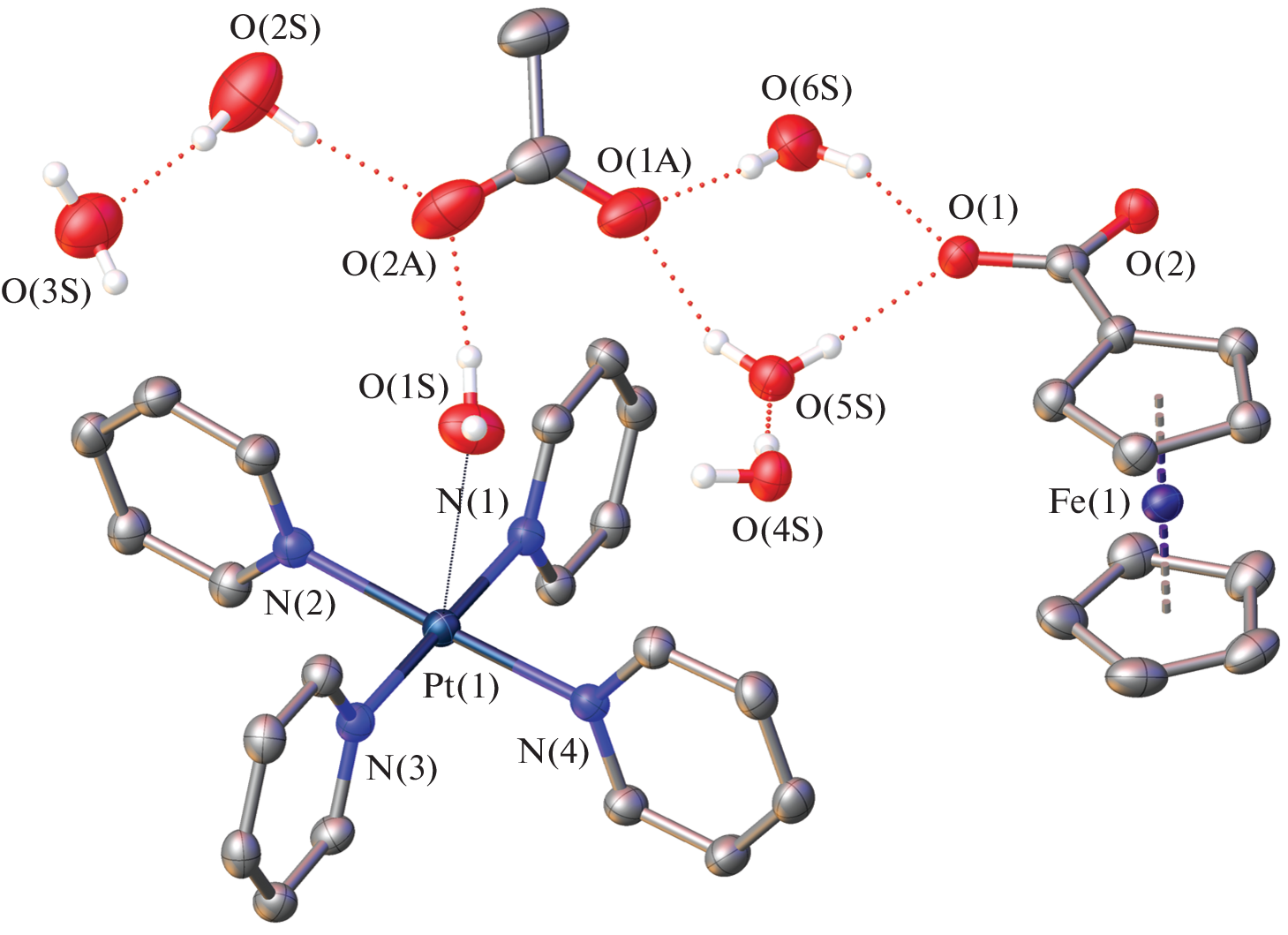 A series of mono- and bimetallic cation-anionic complexes based on the [PtPy4]2+ cation with different single-charge anions of carboxylic acids (RCOO–) is synthesized and structurally characterized. A synthetic approach to the preparation of tetrapyridineplatinum complexes [PtPy4]2+ soluble in polar solvents from available reagents is developed. The reaction of tetrapyridineplatinum dichloride [PtPy4](Cl)2 with silver acetate or trifluoroacetate affords compounds [PtPy4](OOCMe)2·6H2O (I) and [PtPy4](OOCCF3)2· 2H2O (II) in the form of crystalline hydrates (CIF files CCDC nos. 2161100 and 2161101, respectively) in high yields. Other carboxylates can be prepared by the treatment of compound I with an excess of a stronger acid, for example, trifluoroacetic acid, with the formation of the corresponding complex trifluoroacetate [PtPy4](OOCCF3)2·4CF3COOH (IIa) (CIF file CCDC no. 2161102). Another method consists of the displacement of acetic acid with an excess of a lowly volatile acid, for example, pivalic acid, when [PtPy4](Piv)2· 5HPiv (III) is formed from the acid melt, and solvatomorph [PtPy4](Piv)2·4HPiv·3C6H12 (IIIa) (CIF files CCDC nos. 2161103 and 2161104, respectively) is formed in a cyclohexane medium. Heteroanionic heterometallic complex [PtPy4](OOCFc)(OOCMe) (IV) (CIF file CCDC no. 2161105) is shown to be formed by the reaction of complex I with ferrocenecarboxylic acid under mild conditions.