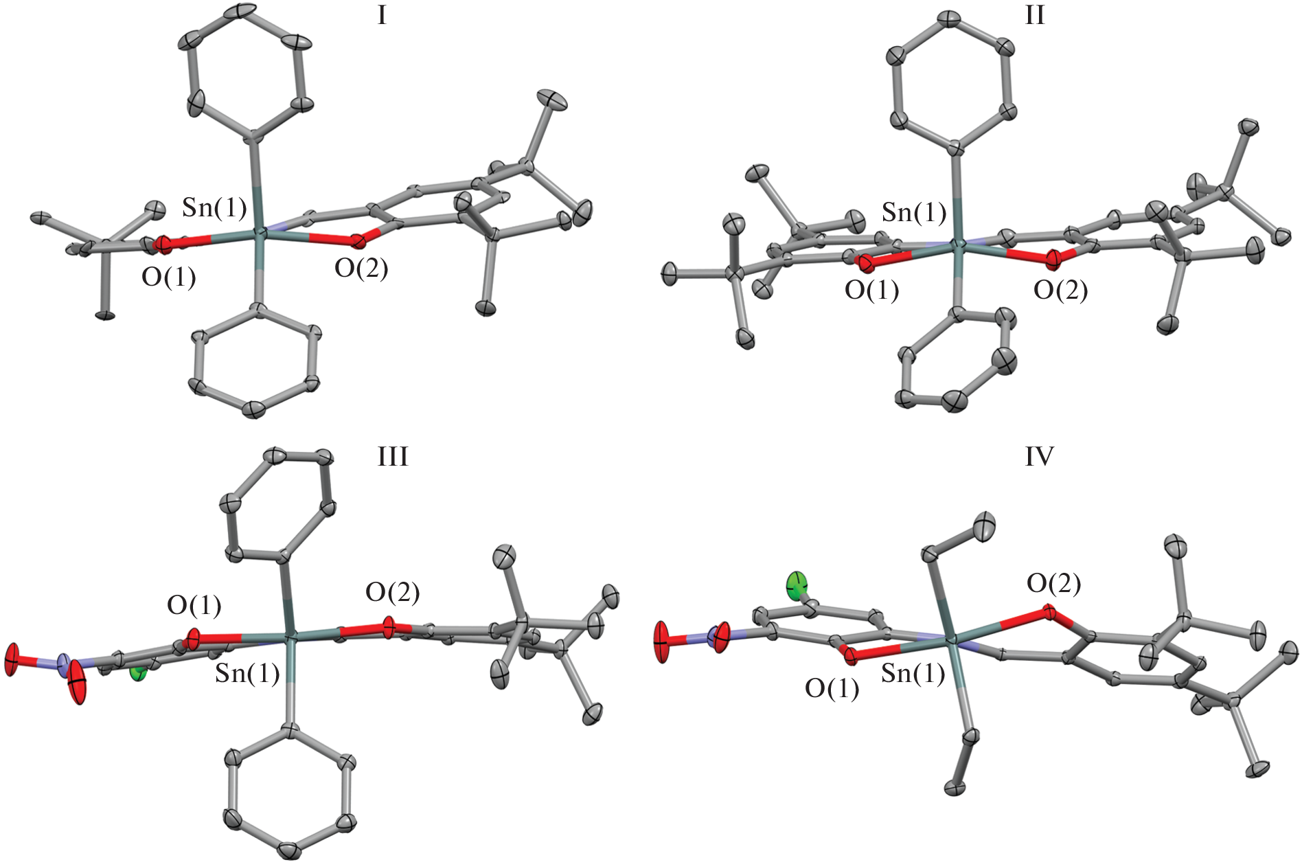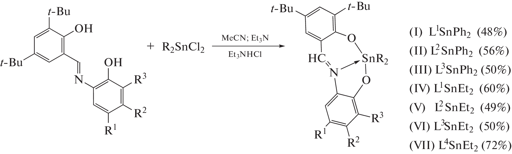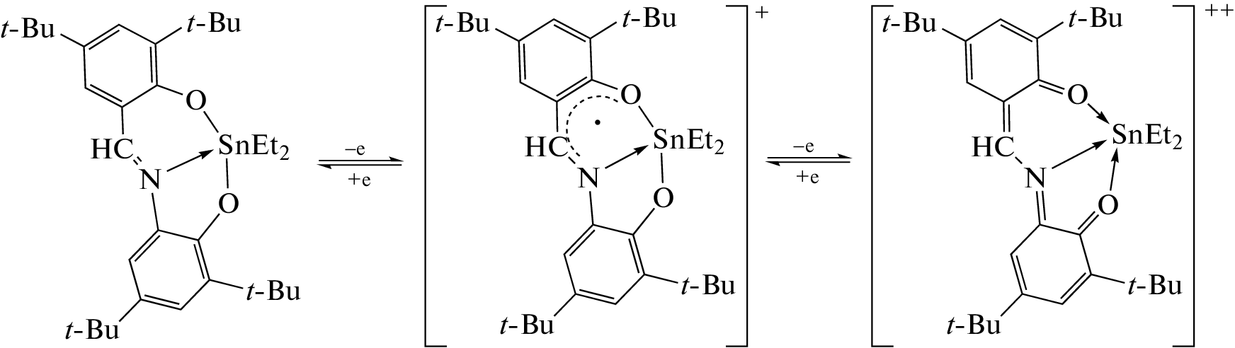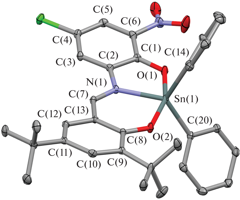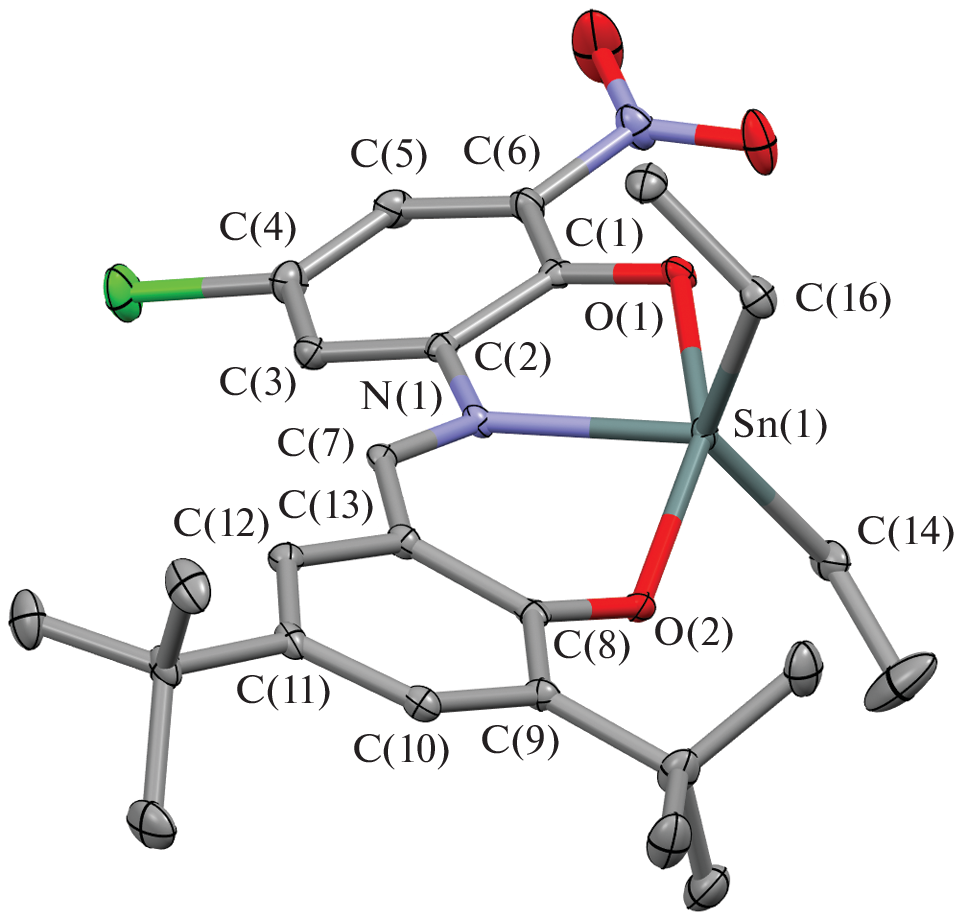 New tin(IV) complexes with O,N,O'-donor Schiff bases (L1H2–L4H2) of the (Ln)SnR2 type (R = Ph (I–III), Et (IV–VII)) are synthesized and characterized. The molecular structures of compounds I–III, VI, and VII in the crystalline form are determined by X-ray diffraction (XRD) (CIF files CCDC nos. 2181140 (I), 2181142 (II), 2181143 (III∙CH3CN), 2181141 (VI), and 2181139 (VII)). Tin complexes I–III and VI are mononuclear pentacoordinate compounds. Crystalline complex VII forms dimers via the pairwise bridging coupling between the oxygen and tin atoms of the mononuclear fragments. The redox-active ligand in the synthesized compounds exists as the iminobis(phenolate) dianion. The electrochemical properties of free ligands and complexes I–VII are studied. In the case of compounds I, II, IV, and V with tert-butyl substituents in the redox-active ligand, the formation of relatively stable monocationic and monoanionic species is electrochemically detected for the first time. The presence of the electroactive nitro group results in the destabilization of the oxidized forms of the complexes and induces the appearance of an additional peak in the cathodic range. The energy gaps between the frontier redox orbitals are determined by the electrochemical and spectral methods. The obtained parameters are close and vary in a range of 2.43–2.68 eV.