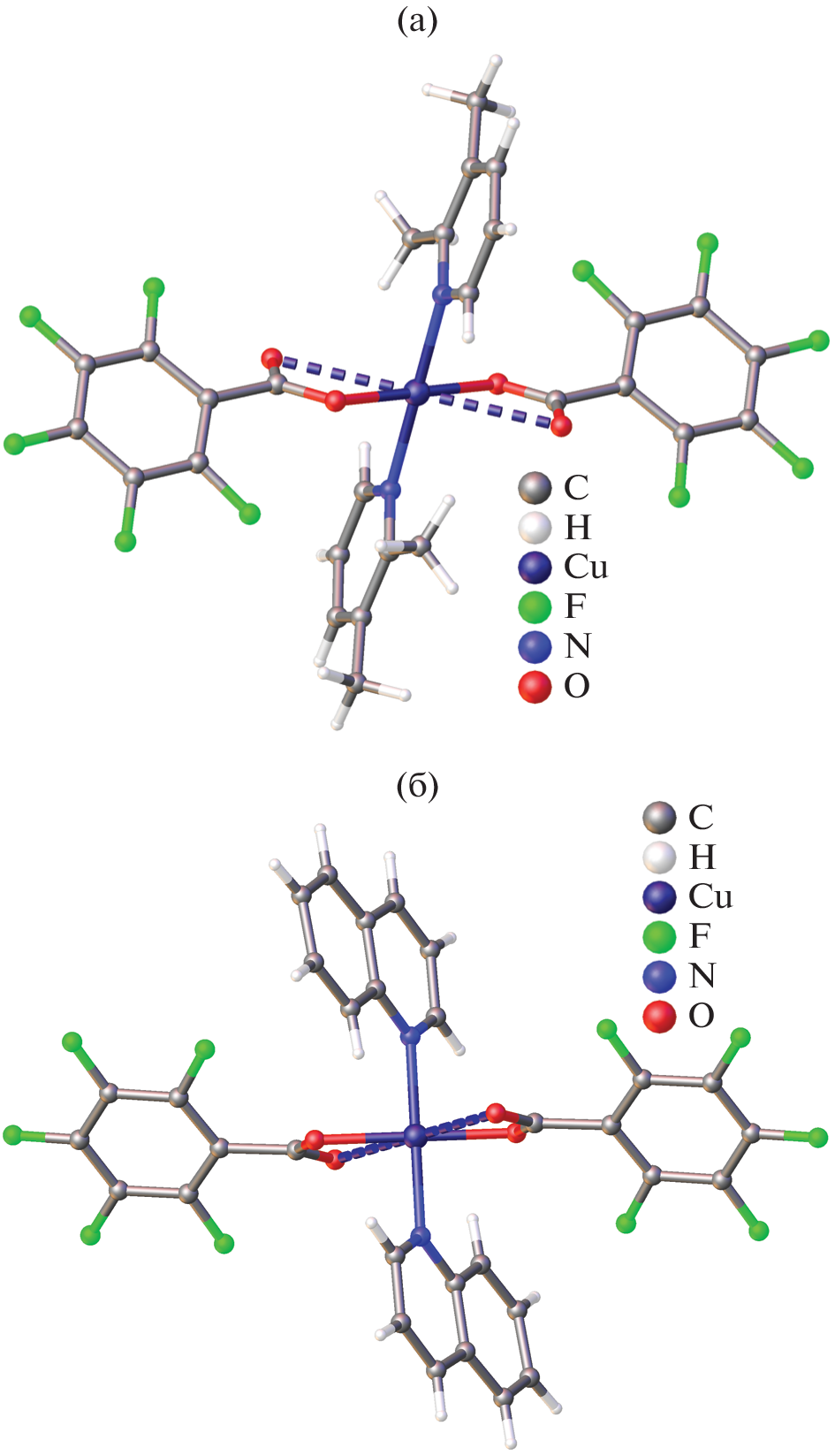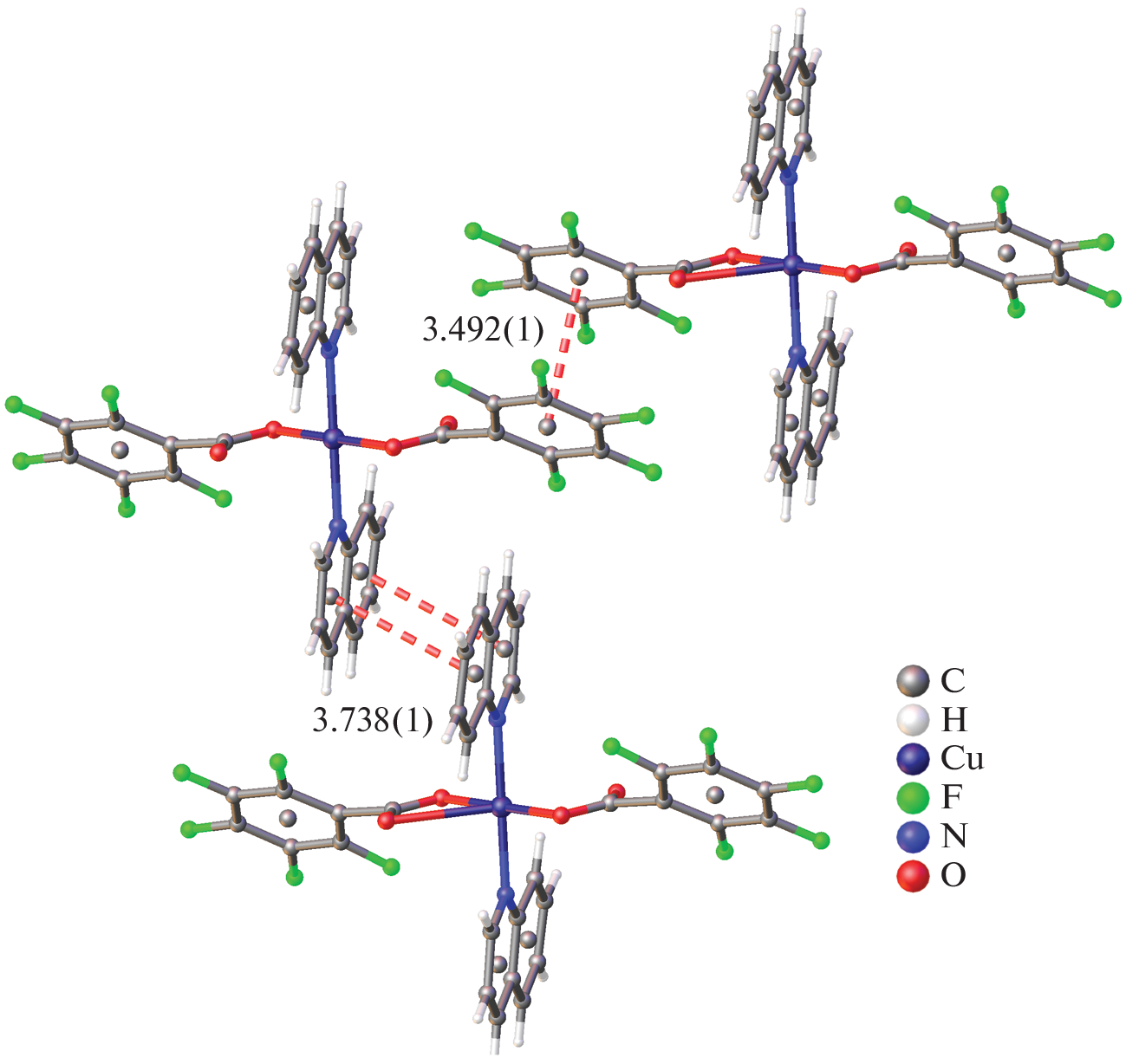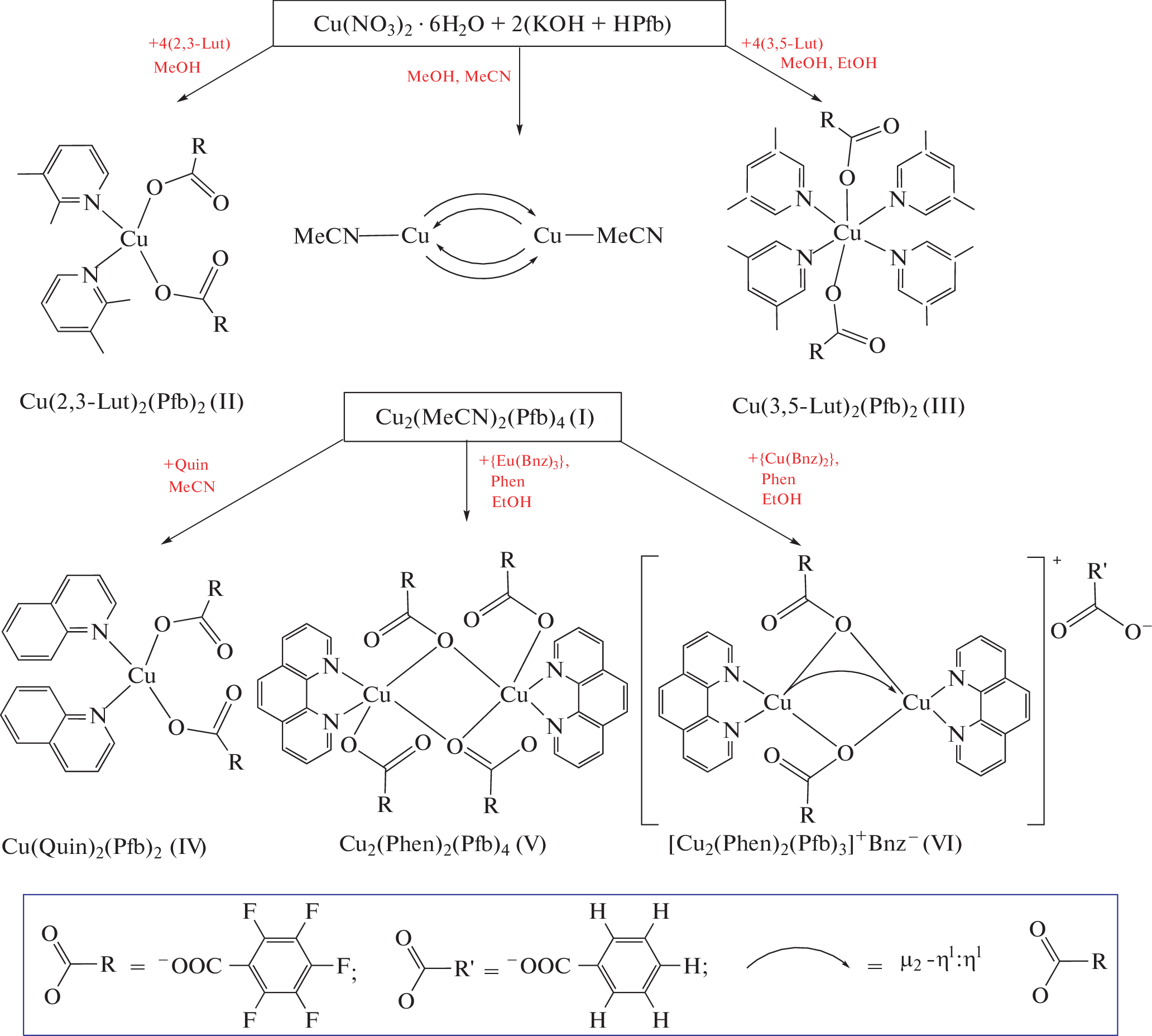 New pentafluorobenzoate (Рfb) copper complexes with 2,3- and 3,5-lutidine (2,3- and 3,5-Lut, respectively), quinoline (Quin), and 1,10-phenanthroline (Рhen) ([Cu2(MeCN)2(Рfb)4] (I), [Cu(2,3-Lut)2(Pfb)2] (II), [Cu(3,5-Lut)4(Pfb)2] (III), [Cu(Quin)2(Pfb)2] (IV), and [Cu2(Phen)2(Pfb)4] (V)) are synthesized by the newly developed methods and characterized. The unusual heteroanionic pentafluorobenzoate benzoate (Вnz) ionic compound [Cu2(Рhen)2(Рfb)3]+(Рnz)– (VI) is synthesized. It is shown that the four-bridge binuclear metal cage of complex I is not retained in the reactions with various pyridine derivatives. In the case of such α-substituted pyridines as 2,3-lutidine and quinoline, the compositions and structures of the final products of the reactions with copper pentafluorobenzoate are independent of the initial ratio of the reagents and crystallization conditions. It is revealed by the Hirshfeld surface analysis that π···π, C–F···π, C–H···F, and F···F interactions make the major contribution to the stabilization of crystal packings of the synthesized complexes.