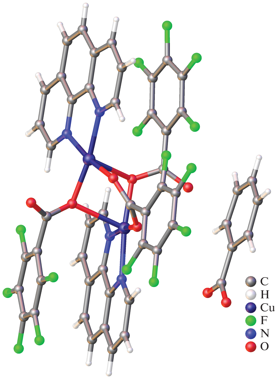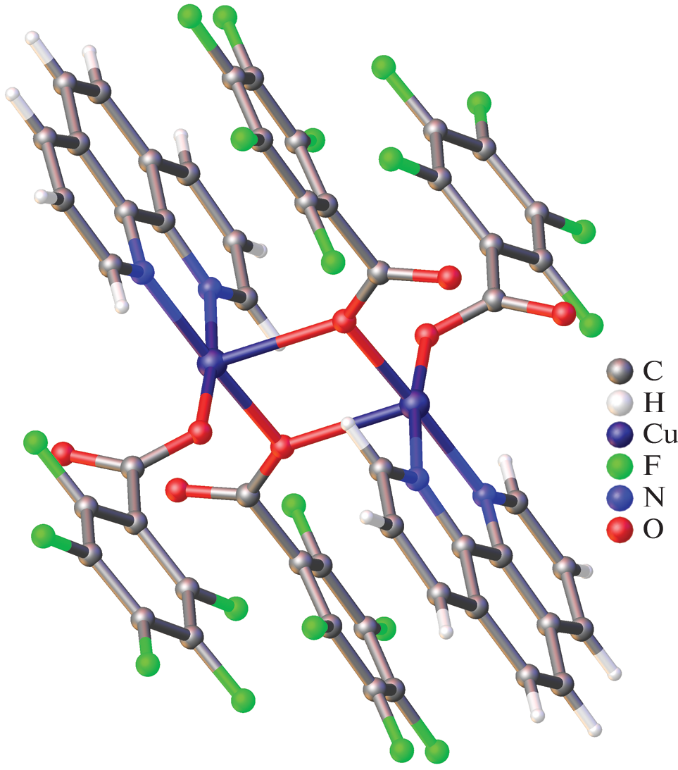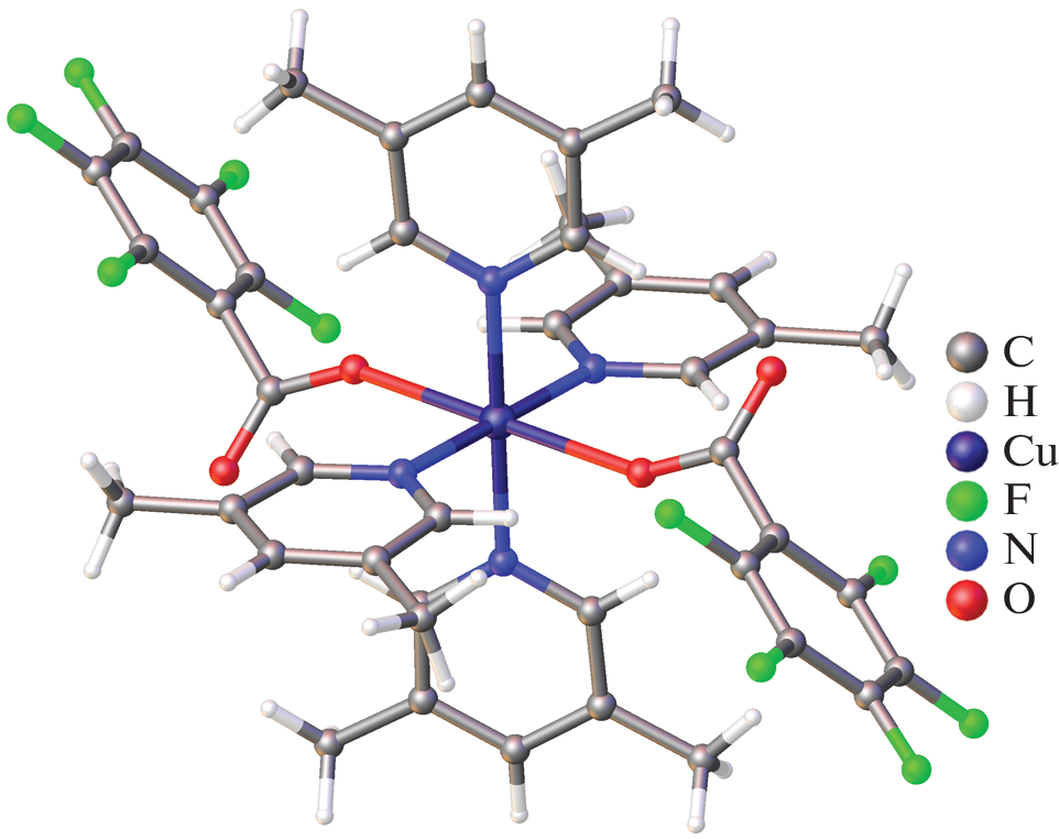 New pentafluorobenzoate (Рfb) copper complexes with 2,3- and 3,5-lutidine (2,3- and 3,5-Lut, respectively), quinoline (Quin), and 1,10-phenanthroline (Рhen) ([Cu2(MeCN)2(Рfb)4] (I), [Cu(2,3-Lut)2(Pfb)2] (II), [Cu(3,5-Lut)4(Pfb)2] (III), [Cu(Quin)2(Pfb)2] (IV), and [Cu2(Phen)2(Pfb)4] (V)) are synthesized by the newly developed methods and characterized. The unusual heteroanionic pentafluorobenzoate benzoate (Вnz) ionic compound [Cu2(Рhen)2(Рfb)3]+(Рnz)– (VI) is synthesized. It is shown that the four-bridge binuclear metal cage of complex I is not retained in the reactions with various pyridine derivatives. In the case of such α-substituted pyridines as 2,3-lutidine and quinoline, the compositions and structures of the final products of the reactions with copper pentafluorobenzoate are independent of the initial ratio of the reagents and crystallization conditions. It is revealed by the Hirshfeld surface analysis that π···π, C–F···π, C–H···F, and F···F interactions make the major contribution to the stabilization of crystal packings of the synthesized complexes.