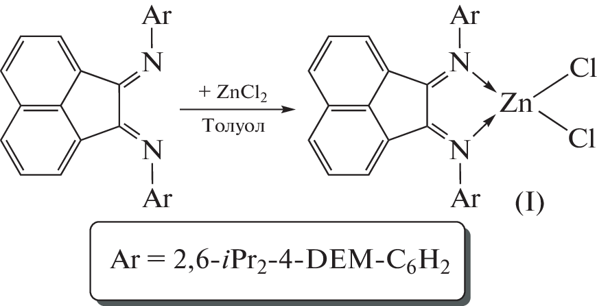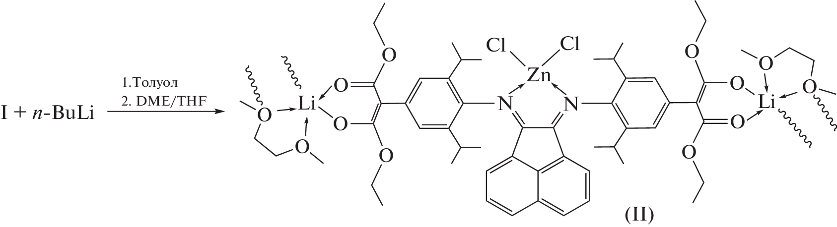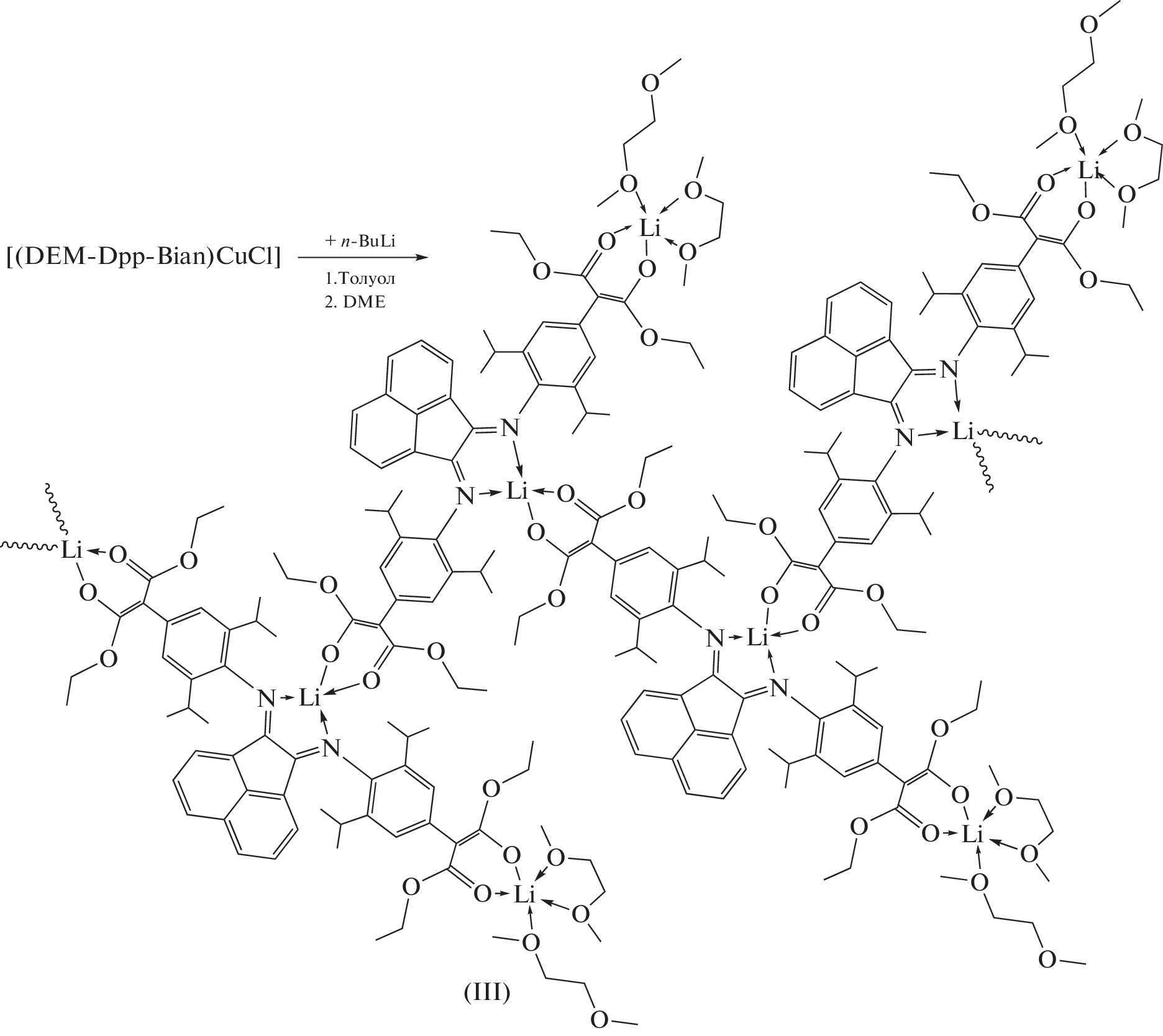 1,2-Bis[(2,6-diisopropyl-4-diethylmalonophenyl)imino]acenaphthene (Dem-Bian) with zinc chloride forms complex [(Dem-Bian)ZnCl2] (I). The reaction of complex I with n-BuLi proceeds with the deprotonation of the malonate fragments and gives 1D coordination polymer [ZnCl2(Dem-Bian)Li(DME)2]n (II). The reaction of [(Dem-Bian)CuCl] with n-BuLi affords 1D polymer [(Dem-Bian)Li2(DME)2]n (III). Compounds I–III are characterized by elemental analysis and IR spectroscopy. Derivatives I and II are characterized by 1Н NMR spectroscopy. The crystal structures of compounds II and III are determined by X-ray diffraction (XRD). Their thermal stability is studied by thermogravimetric analysis.