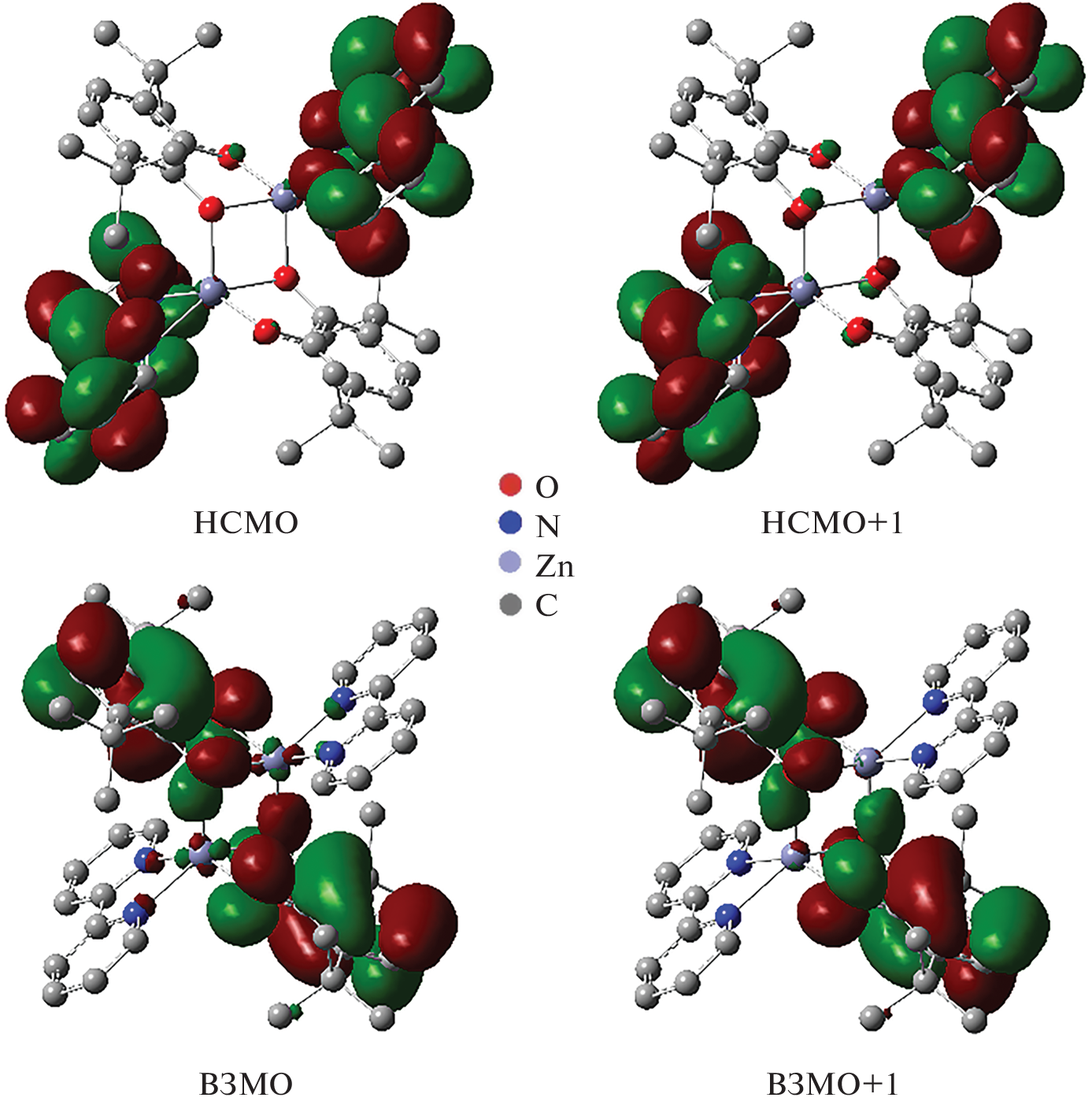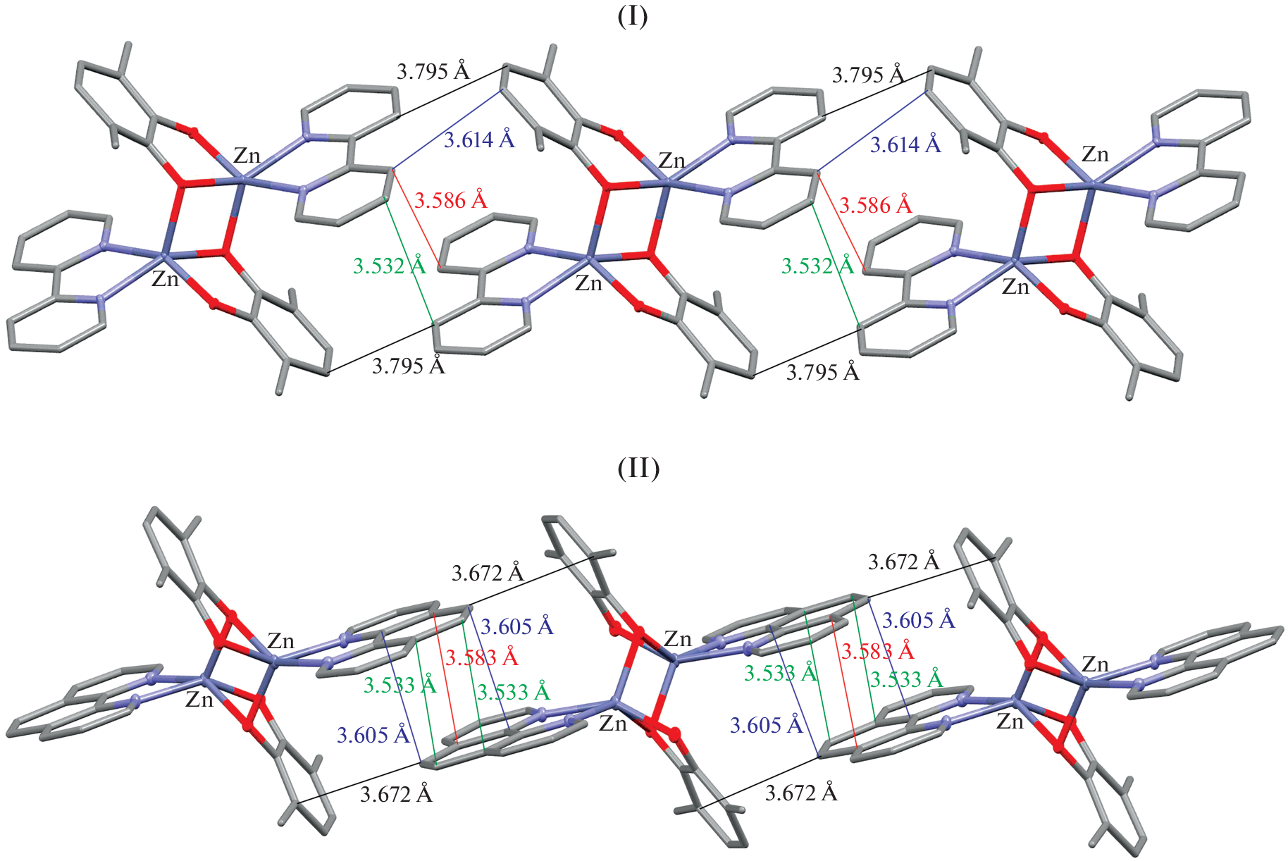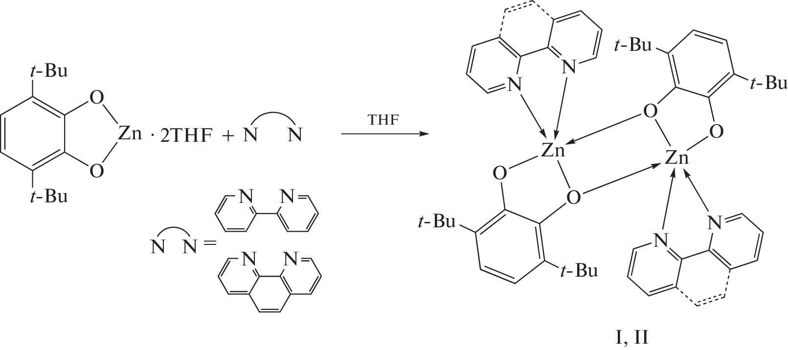 New heteroleptic zinc catecholate complexes based on 3,6-di-tert-butyl-o-benzoquinone and containing metal-coordinated N-donor ligands (2,2'-bipyridine and phenanthroline) were prepared by ligand exchange. According to X-ray diffraction data, both complexes were dimers with multiple intermolecular π–π interactions between the aromatic moieties of neighboring molecules (CCDC nos. 2222704 (I), 2222705 (II)). The electronic transmission spectra of crystalline samples of I and II and their solutions show broad absorption bands in the visible region with a maximum at about 500 nm.