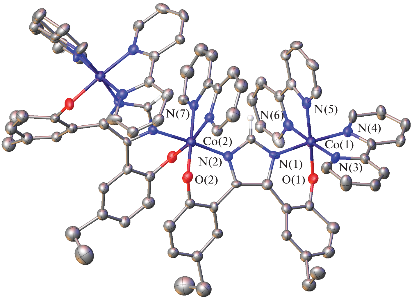 The trinuclear cobalt(III) complex [(Bipy)5Co3(L)2](Cl)3 (I) is synthesized by the template reaction of 2,2'-(1H-imidazole-4,5-diyl)bis(4-ethylphenol) (L) and bis(2,2-bipyridine)cobalt(II) dichloride in the presence of diazabicycloundecene. The complex is isolated in the individual state and characterized by elemental analysis, cyclic voltammetry, UV-VIS spectroscopy, and X-ray diffraction (XRD) (CIF file СCDC no. 2201135). According to the obtained data, the cobalt ions in trinuclear complex I have the oxidation state +3, and the complex formation occurs with the oxidation of the initial cobalt(II) ions.